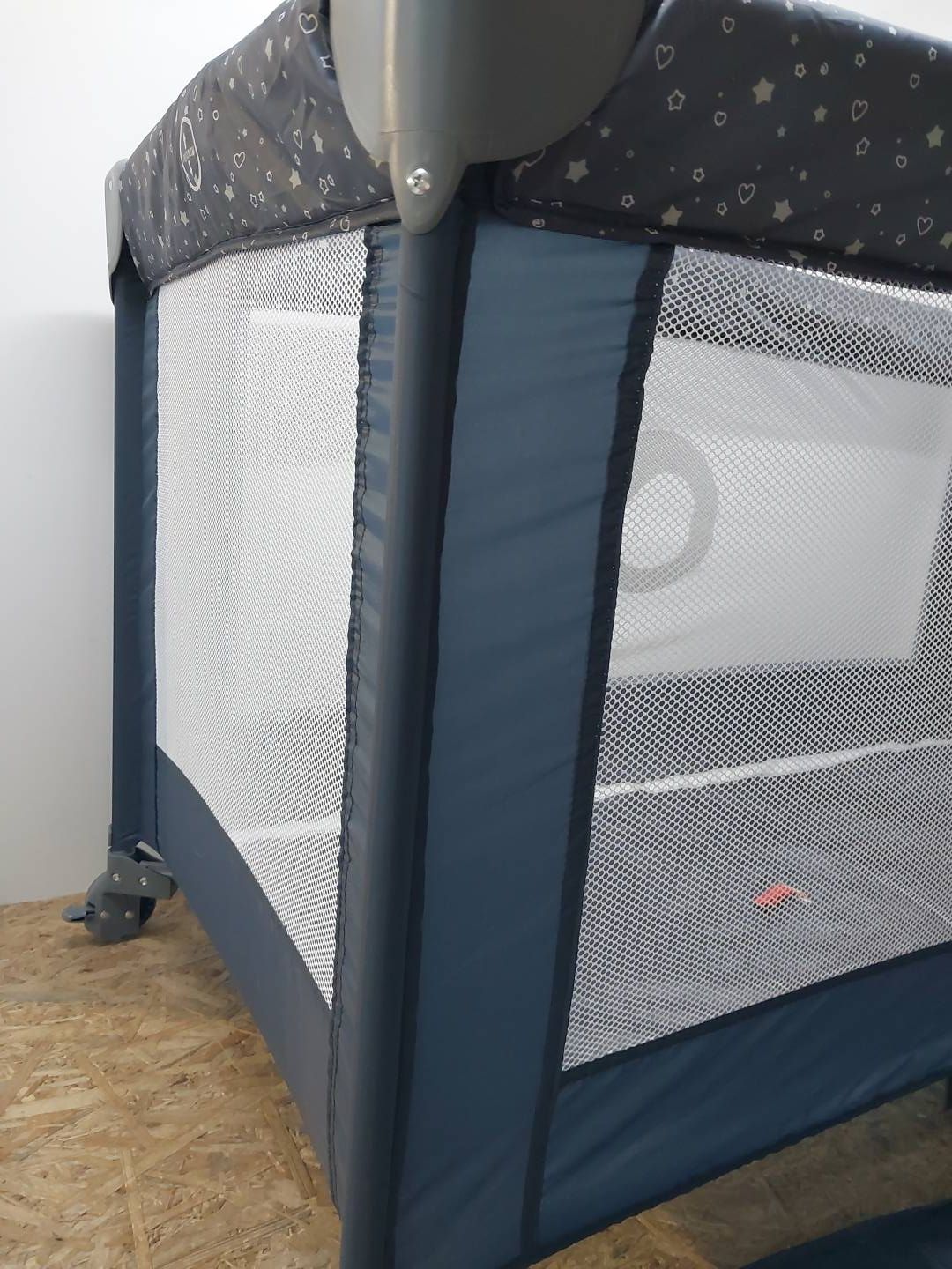 - Przewiewna siatka na dłuższych bokach i jednym krótszym zapewnia odpowiednią cyrkulację powietrza i podgląd na pociechę.