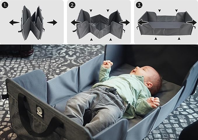 Łatwy do przechowywania pod wózkiem lub nawet w drzwiach auta. Po rozłożeniu dziecko może spać na materacu 41 x 75 cm. Materac ma 1 cm. pianka, bardzo łatwa do czyszczenia wilgotną ściereczką.
