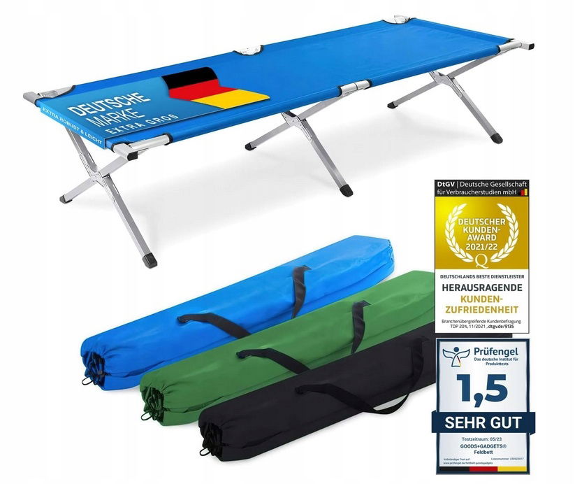 Wojskowe łóżko polowe wykonane z aluminium Wysokiej jakości łóżko kempingowe wykonane z anodyzowanego aluminium, całkowicie odporne na rdzę oraz bardzo, bardzo trwałe i solidne. Dzięki dodatkowo wzmocnionym zawiasom i 3 stabilnym wspornikom krzyżowym, a także wytrzymałej nylonowej tkaninie .