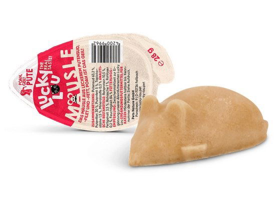 Lucky Lou Mäusle IndykRealizując naszą misję stworzenia najlepszej na świecie karmy dla kotów, stworzyliśmy kolejny rozkoszny przysmak: przekąskę w kształcie myszy. Świetnie, prawda? Najlepszy pasztet o naprawdę najlepszym smaku Lucky Lou. Ze względu na kuszący kształt myszy, koty nie mogą powstrzymać się od podchodzenia do niej, aby ją zbadać i skubać. Mäusle są po prostu pyszne!Jak zawsze w Lucky Lou możesz polegać na przyjaznych kotom składnikach. Bez zbóż i bez dodatku cukru - to nie trafia do kociej miski! Dużo mięsa i ryb! Codziennie wybieraj pomiędzy tuńczykiem, indykiem, kurczakiem i kiełbasą z wątróbki. Przysmak jest odpowiedni także dla kotów wrażliwych na składniki odżywcze: 1 mysz = 1 rodzaj mięsa = monobiałko = super tolerowane. Po prostu jakość stworzona z kocim wyczuciem w Niemczech!Lucky Lou Mäusle jest karmą uzupełniającą, abyś mógł rozpieszczać swojego kota urozmaicając jego codzienne menu. Więc zrób to! Pokocha Cię za różnorodność w misce. A jeśli masz kocich przyjaciół: nie odwiedzaj ich z pustymi łapkami! Spakuj im nasze myszy. Nieważne, czy to mała nagroda, czy wyraz miłości, te myszy są po prostu świetne! Doskonale uzupełniają zbilansowaną dietę w połączeniu z Lucky Lou Lifestage lub SuperMono².Wszystkie produkty Mäusle są starannie porcjowane, a ich podanie jest bardzo łatwe i praktyczne. Lucky Lou Mäusle – to naprawdę łatwa zdobycz!Skład:Bulion z indyka 63,2%, filet z indyka 30%, tłuszcz z indyka 5%, skrobia z tapioki 1,5%, minerały 0,3%Składniki analityczne:Białko surowe 10,5%, zawartość tłuszczu 3,5%, popiół surowy 1%, włókno surowe 0,2%, wilgotność 84%Dawkowanie: Podawaj jako uzupełnienie diety.