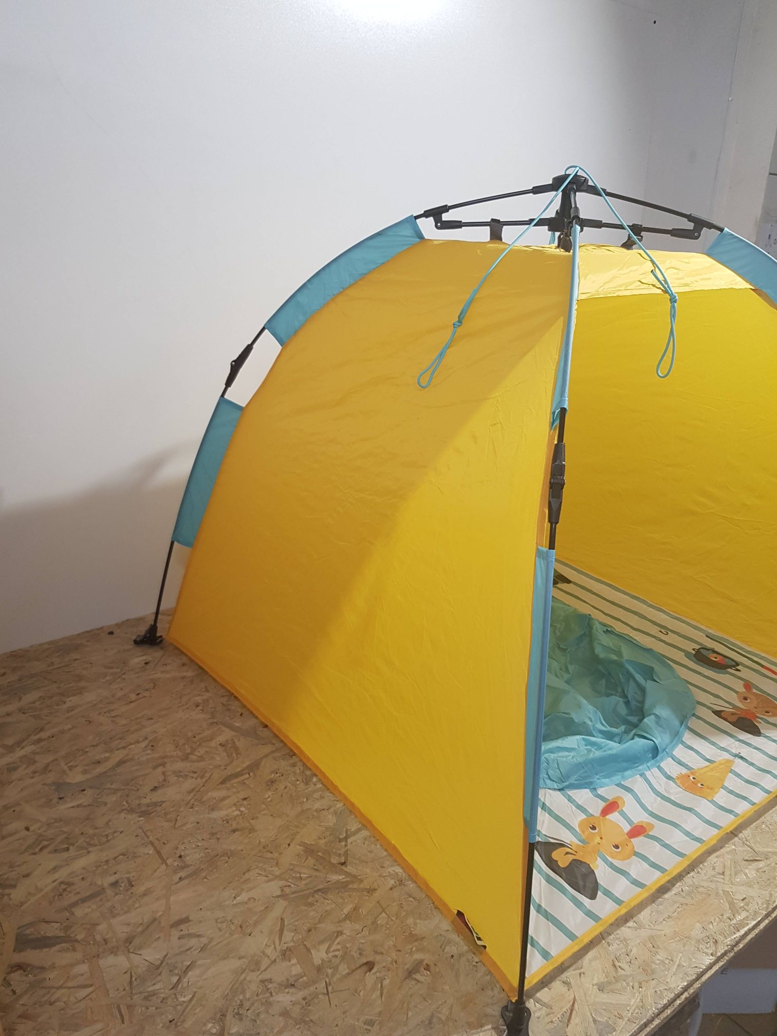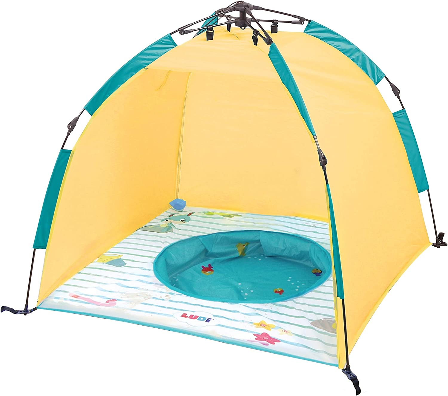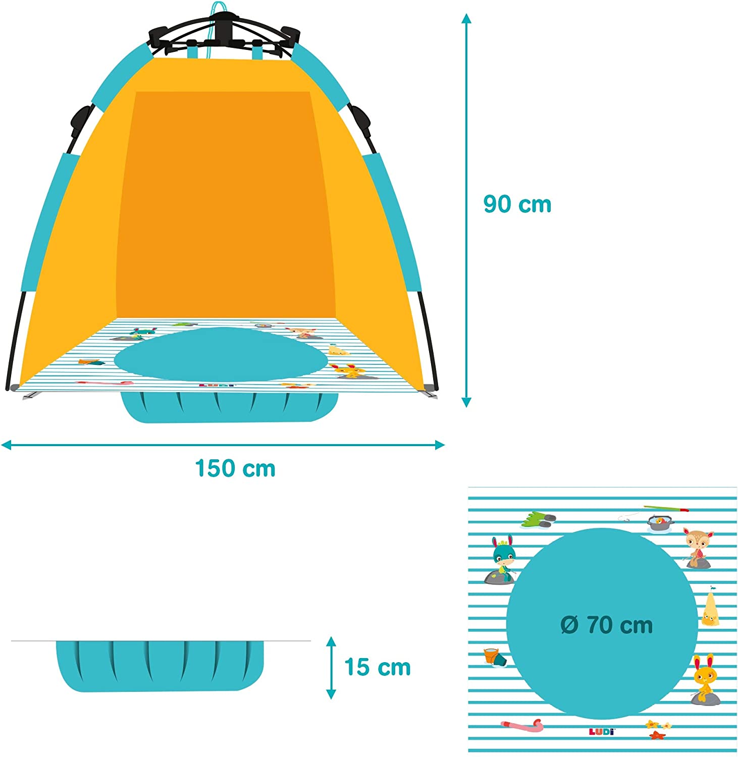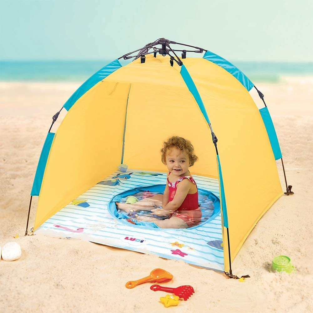 Błyskawicznie rozpinany: w ciągu dwóch sekund dziecko jest zabezpieczone i gotowe do kąpieli. Namiot plażowy i namiot UV w rozmiarze dziecięcym, do ochrony przed słońcem, wiatrem i piaskiem. Łatwy i szybki mechanizm otwierania i zamykania za pomocą linki. Dostarczany z 4 drążkami do mocowania namiotu w piasku. Nadaje się dla dzieci od 10 miesiąca życia. Wymiary: 105 x 105 x 90 cm. 100% poliester, odporny na działanie promieni UV 50. Wystarczy przetrzeć wilgotną ściereczką.