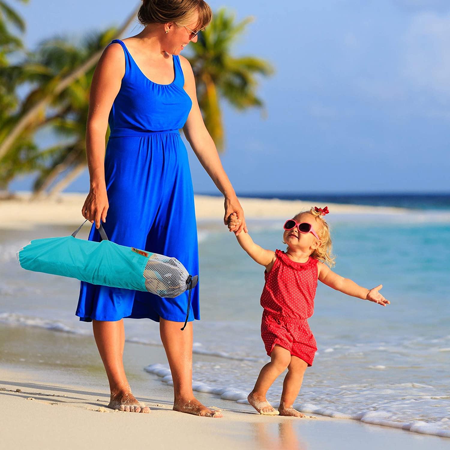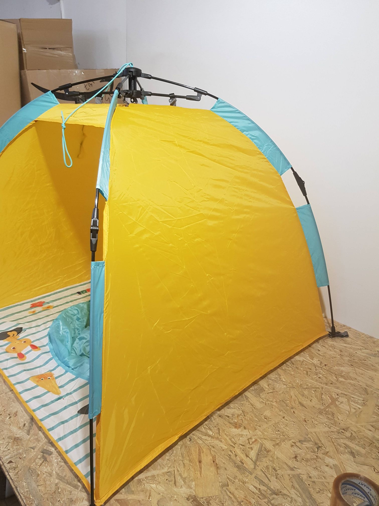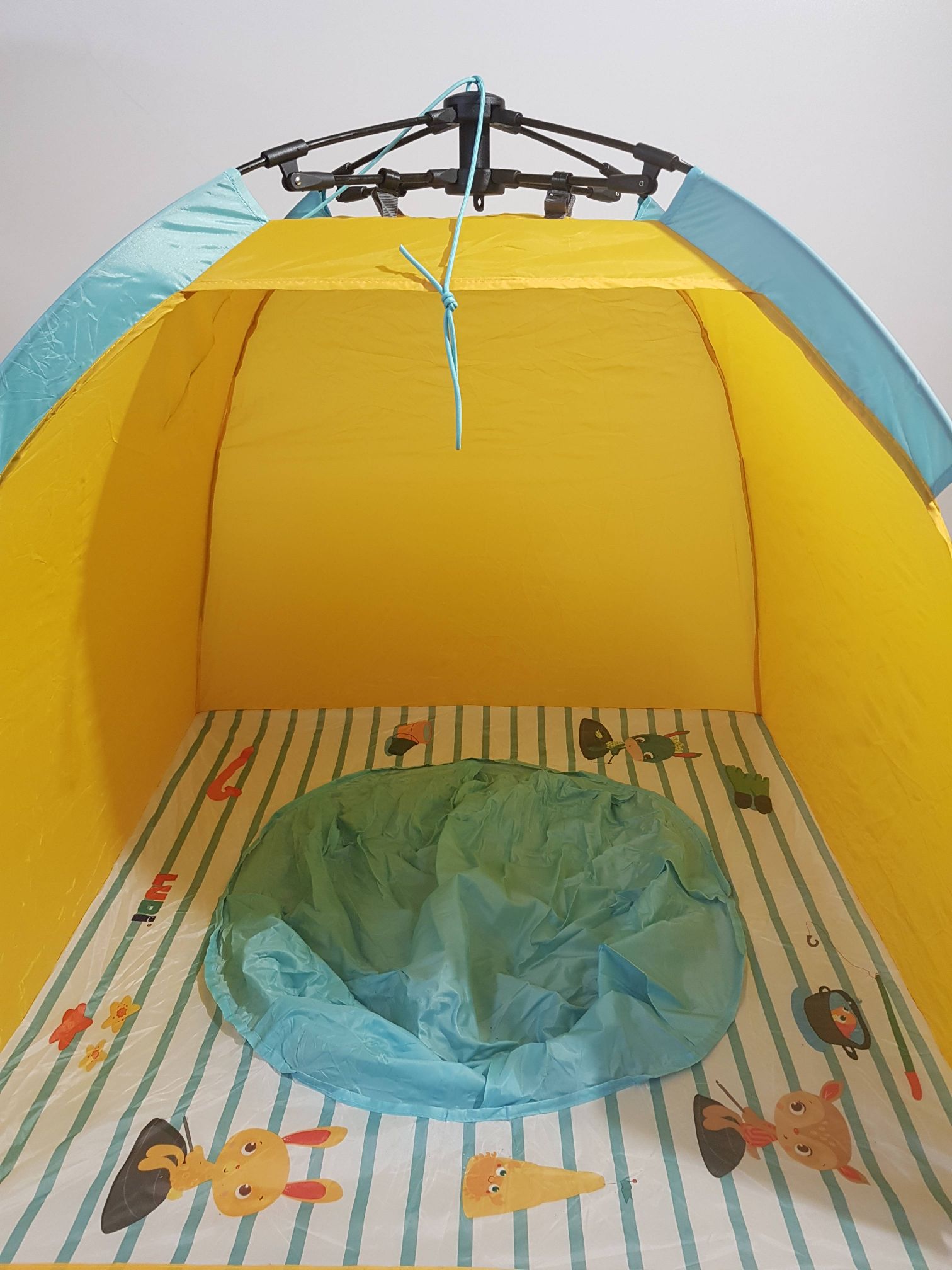 Błyskawicznie rozpinany: w ciągu dwóch sekund dziecko jest zabezpieczone i gotowe do kąpieli. Namiot plażowy i namiot UV w rozmiarze dziecięcym, do ochrony przed słońcem, wiatrem i piaskiem. Łatwy i szybki mechanizm otwierania i zamykania za pomocą linki. Dostarczany z 4 drążkami do mocowania namiotu w piasku. Nadaje się dla dzieci od 10 miesiąca życia. Wymiary: 105 x 105 x 90 cm. 100% poliester, odporny na działanie promieni UV 50. Wystarczy przetrzeć wilgotną ściereczką.