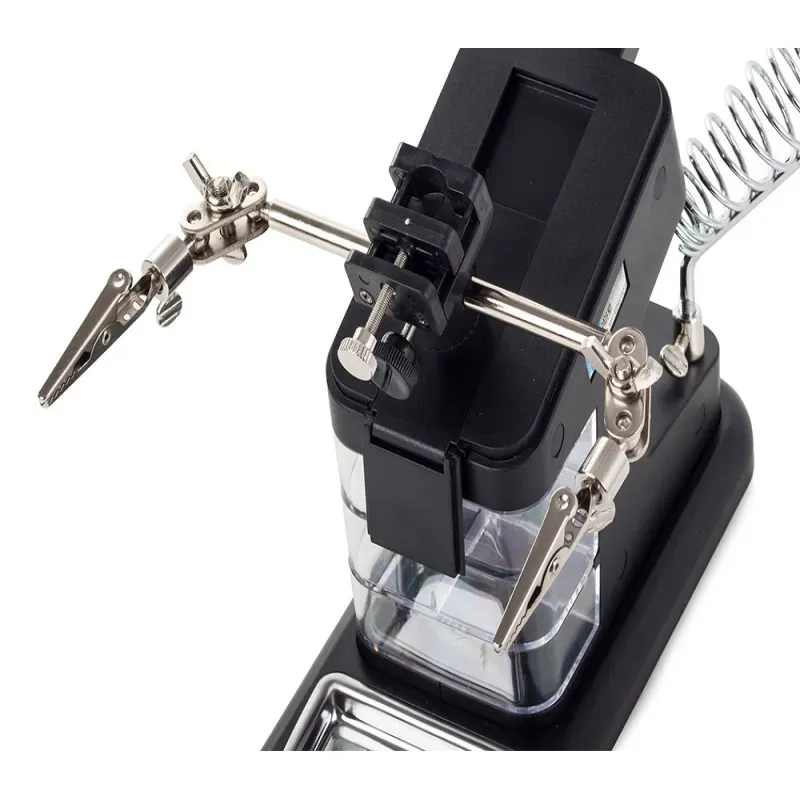 Posiada silne krokodylki, które mocno trzymają obrabiany przedmiot oraz w pełni regulowane przeguby do żądanego zamocowania przedmiotu.