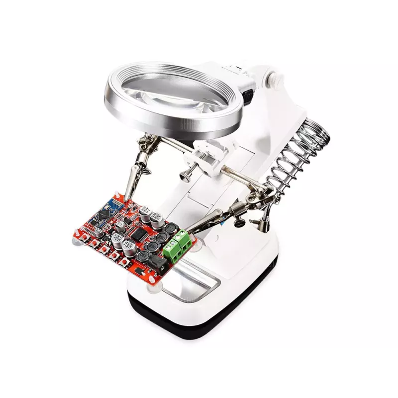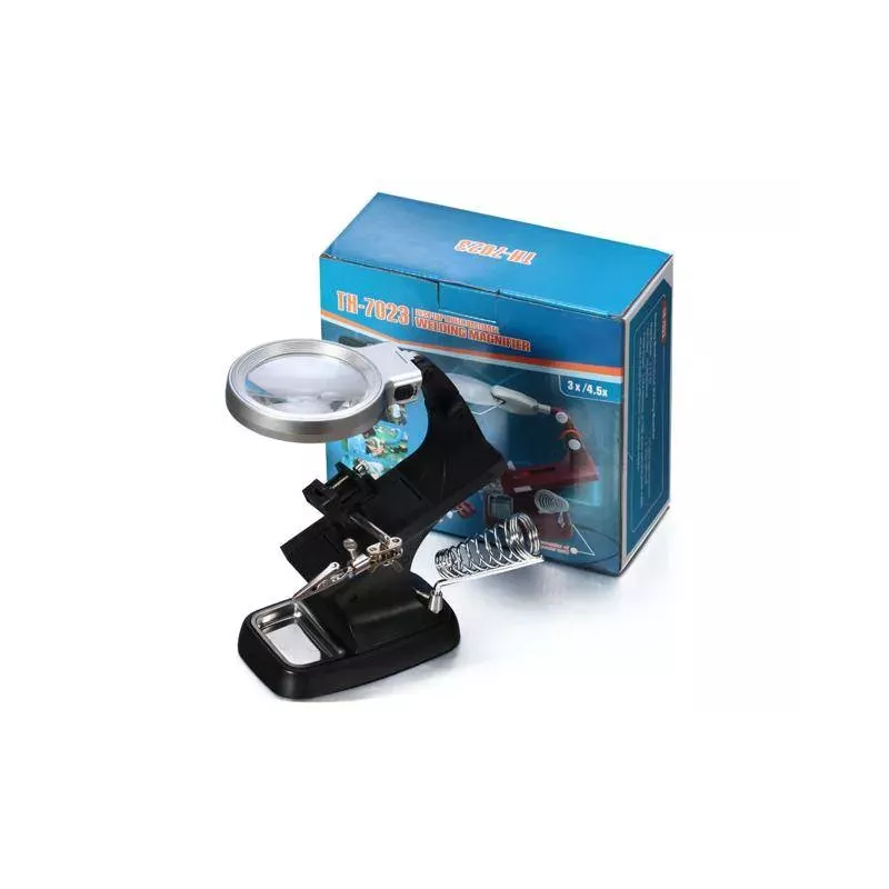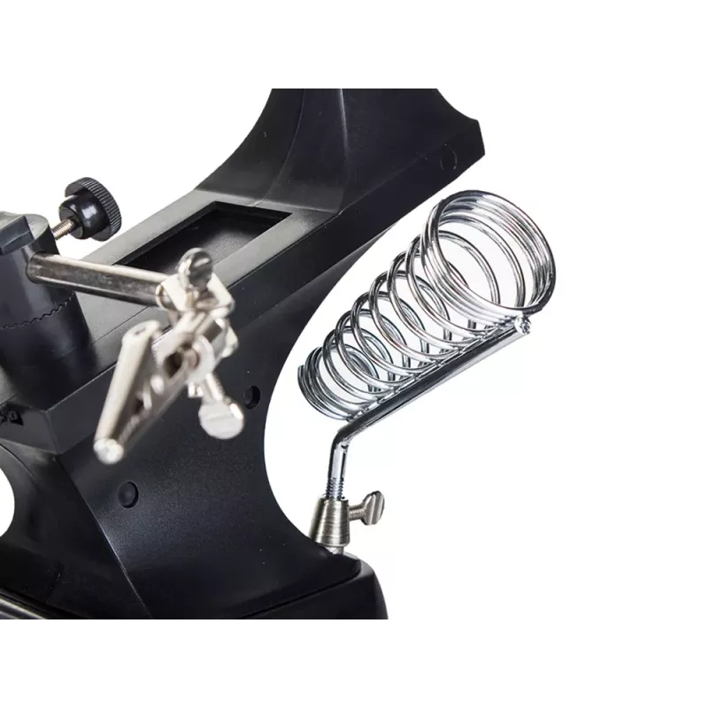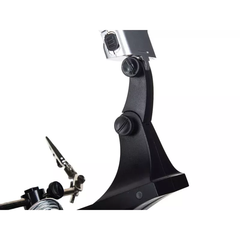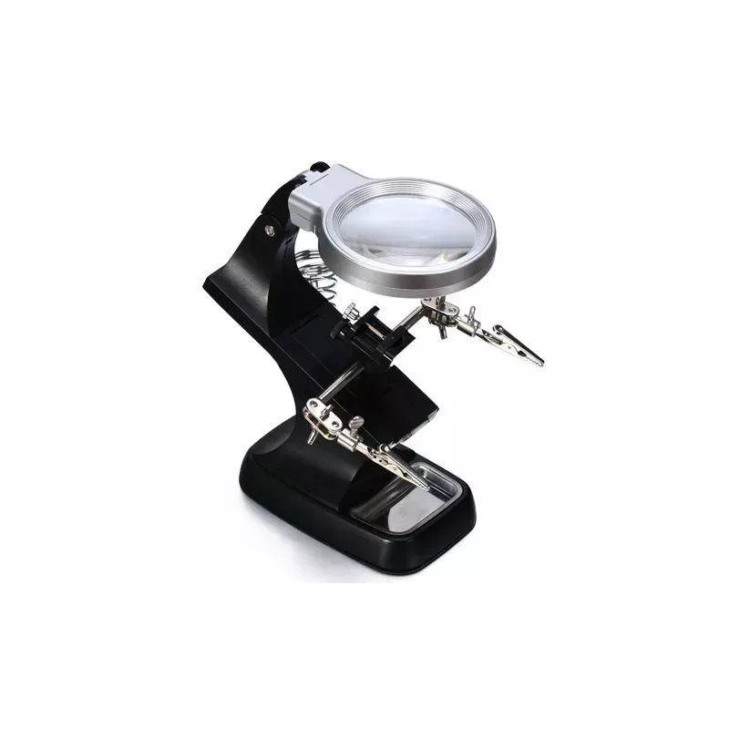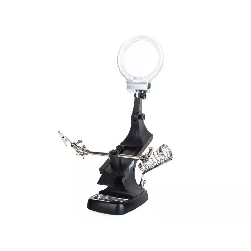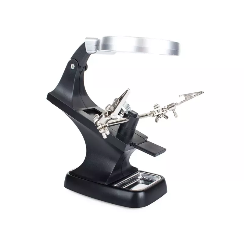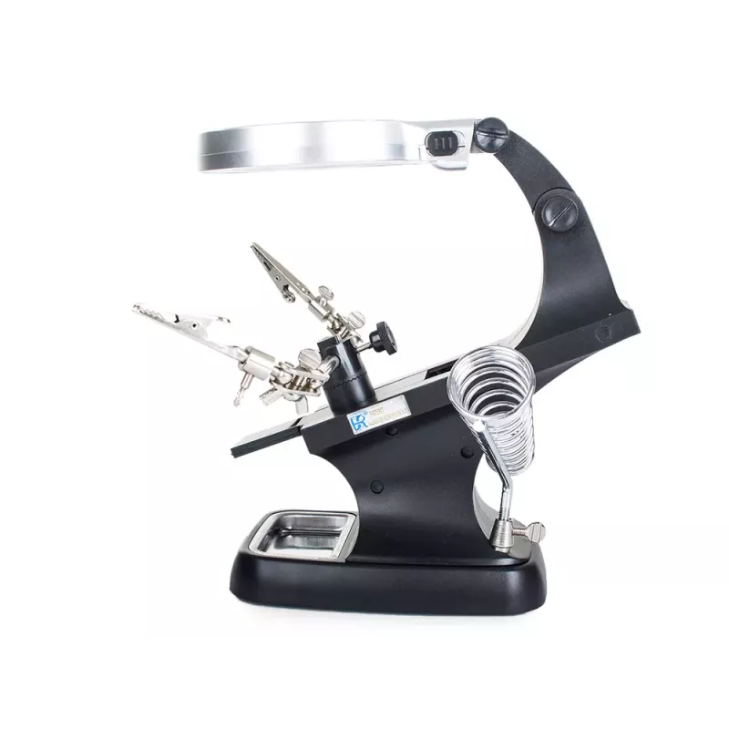 Posiada silne krokodylki, które mocno trzymają obrabiany przedmiot oraz w pełni regulowane przeguby do żądanego zamocowania przedmiotu. Dzięki dużemu szkle powiększającemu oraz diod 10 x LED, obraz jest bardzo wyraźny i czytelny.