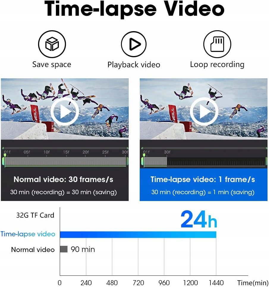 - Nagrywanie poklatkowe - Gdy samochód jest wyłączony, automatycznie uruchamia się nagrywanie jednej klatki na sekundę (normalny tryb nagrywania 1FPS/1S). Co 30 minut nagrania zostanie skompresowane do 1 minuty (dane do naszych testów: 24 godziny, tylko 1 GB)