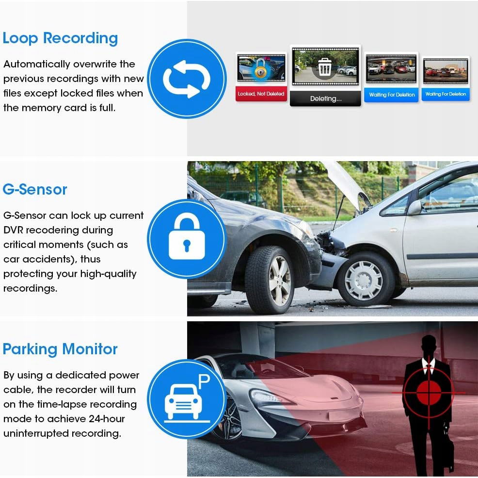 - Nagrywanie w pętli i czujnik G - Nagrywanie w pętli automatycznie zastąpi najwcześniejszy segment wideo, gdy przestrzeń pamięci jest pełna. Dzięki włączonemu czujnikowi G automatycznie blokuje i zapisuje wideo, gdy napotkasz nagły wstrząs i kolizję.
