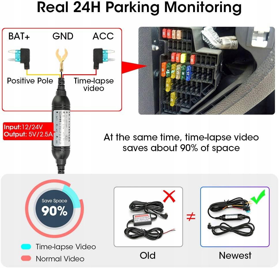 - 24-godzinny nadzór - Zestaw jest podłączony do akumulatora samochodowego lub zasilania skrzynki bezpiecznikowej, sprawia, że monitor parkowania kamery samochodowej działa i może nieprzerwanie zasilać kamerę samochodową przez 24 godziny.