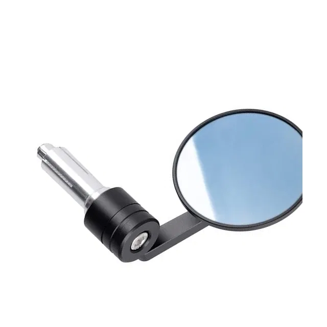 Lusterko motocyklowe premium montowane na końcu kierownicy, charakteryzujące się okrągłym kształtem i możliwością regulacji w zakresie 360 stopni. Wykonane w kolorze czarnym, zapewnia szerokie pole widzenia i estetyczne wykończenie. Jest to element poprawiający bezpieczeństwo i wygląd motocykla.