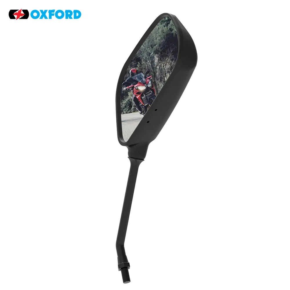 Lusterko motocyklowe uniwersalne marki Oxford, przeznaczone do montażu po prawej stronie. Charakteryzuje się podłużnym, owalnym kształtem (oblong) i jest wyposażone w gwint M10x1.25 o prawym skoku, co zapewnia szeroką kompatybilność.