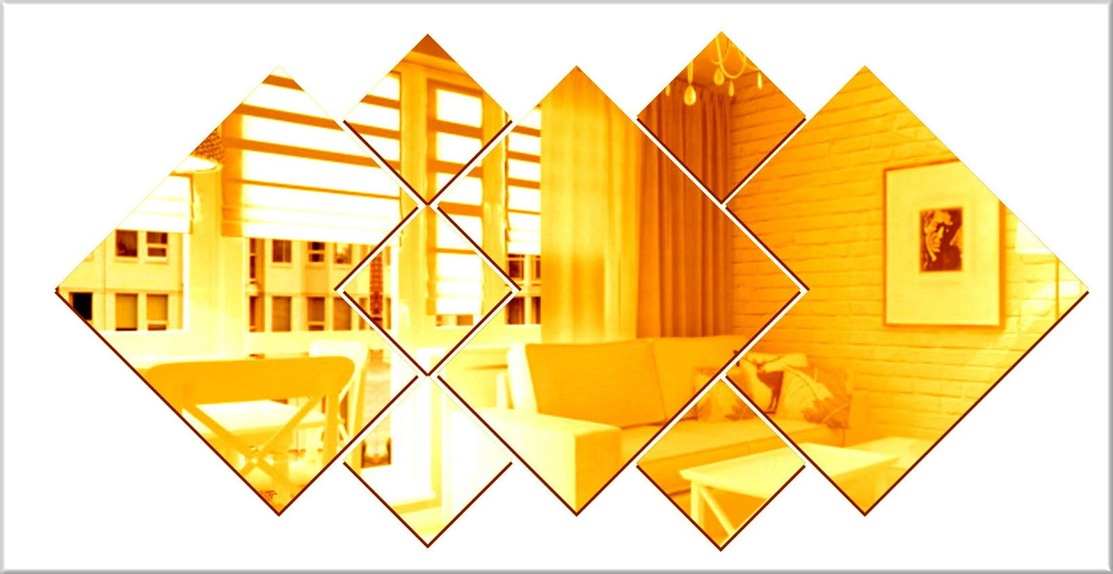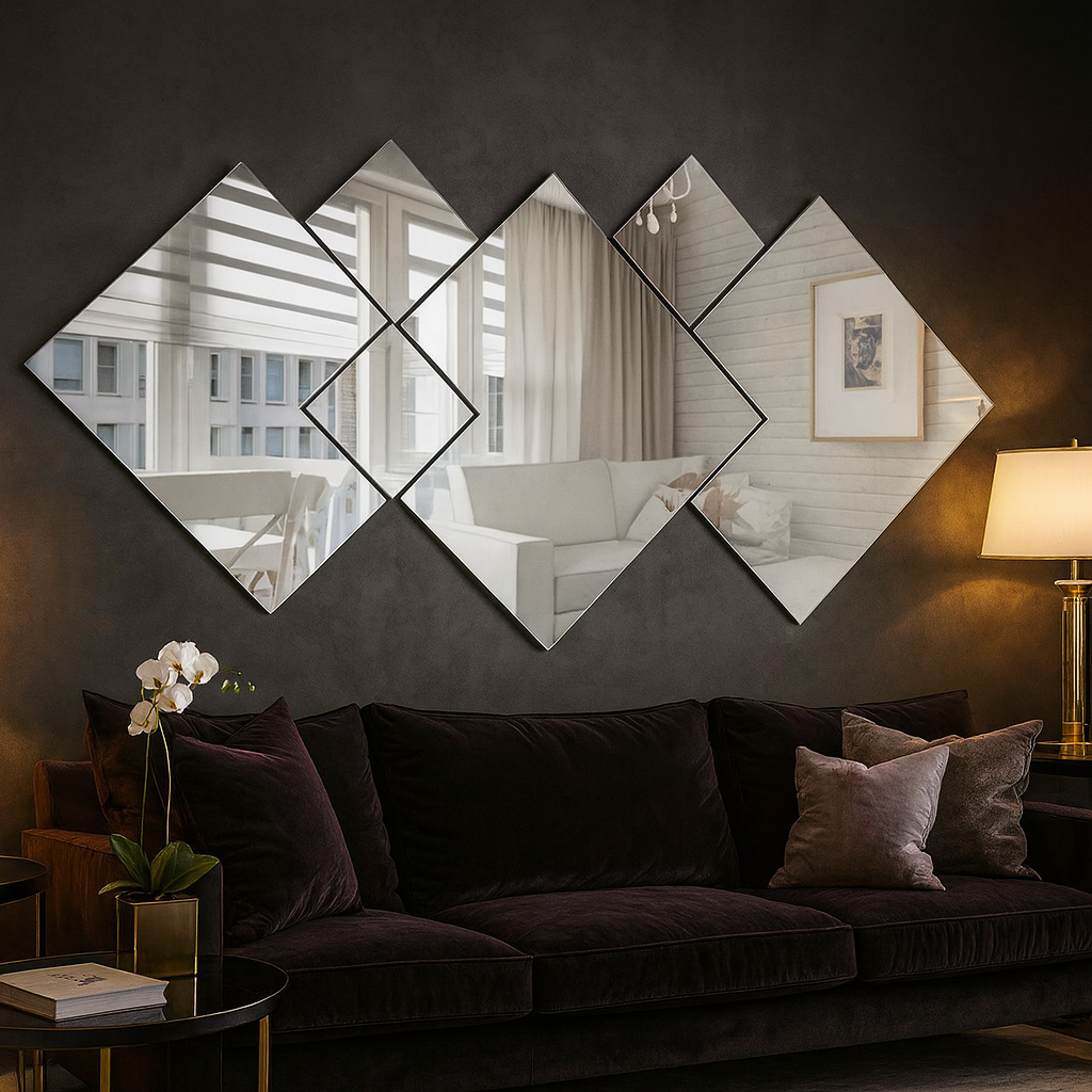 Lustro akrylowe w kompozycji z geometrycznych rombów — lekka, nietłukąca dekoracja ścienna o subtelnym rytmie i eleganckim połysku. Idealne do salonu, sypialni i pokoju dziecięcego. Produkt w 100% Polski.