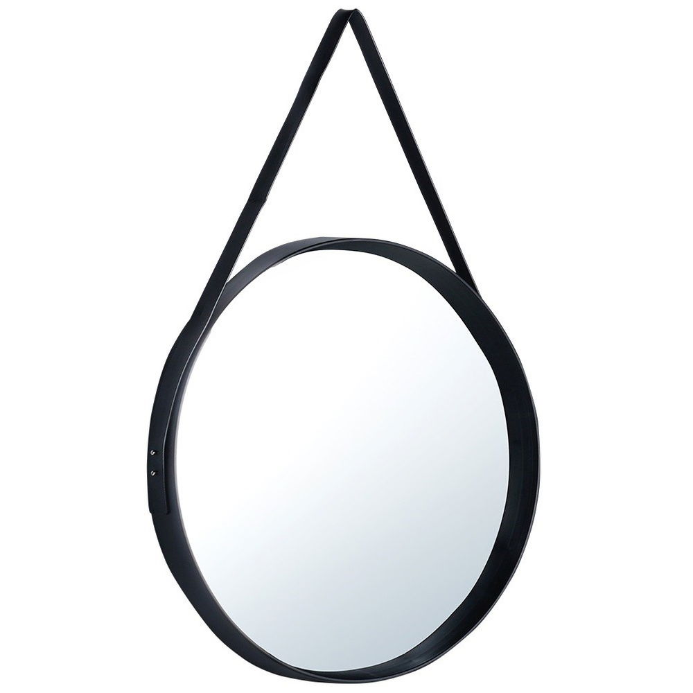 ŚCIENNE - Eleganckie lustro ścienne zawieszane na pasku. Lustro można zawiesić na ścianie. Lustro ma średnicę 52 cm, wysokość z paskiem 77 cm, grubość z ramą wynosi 4,5 cm.