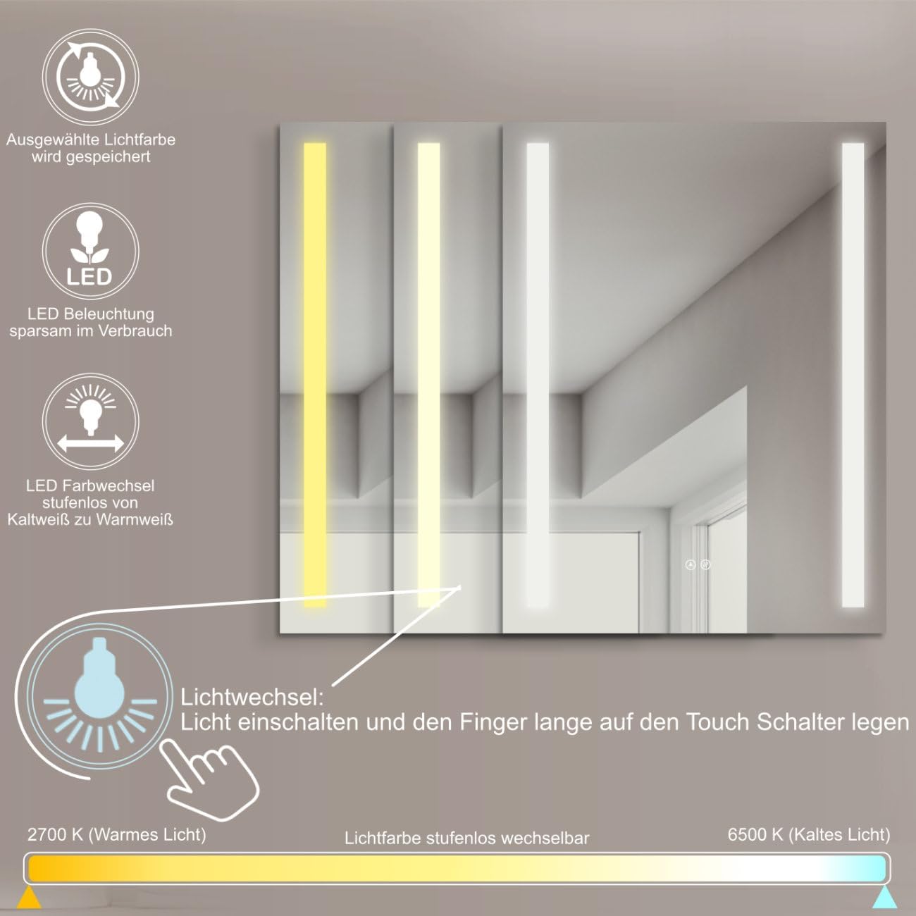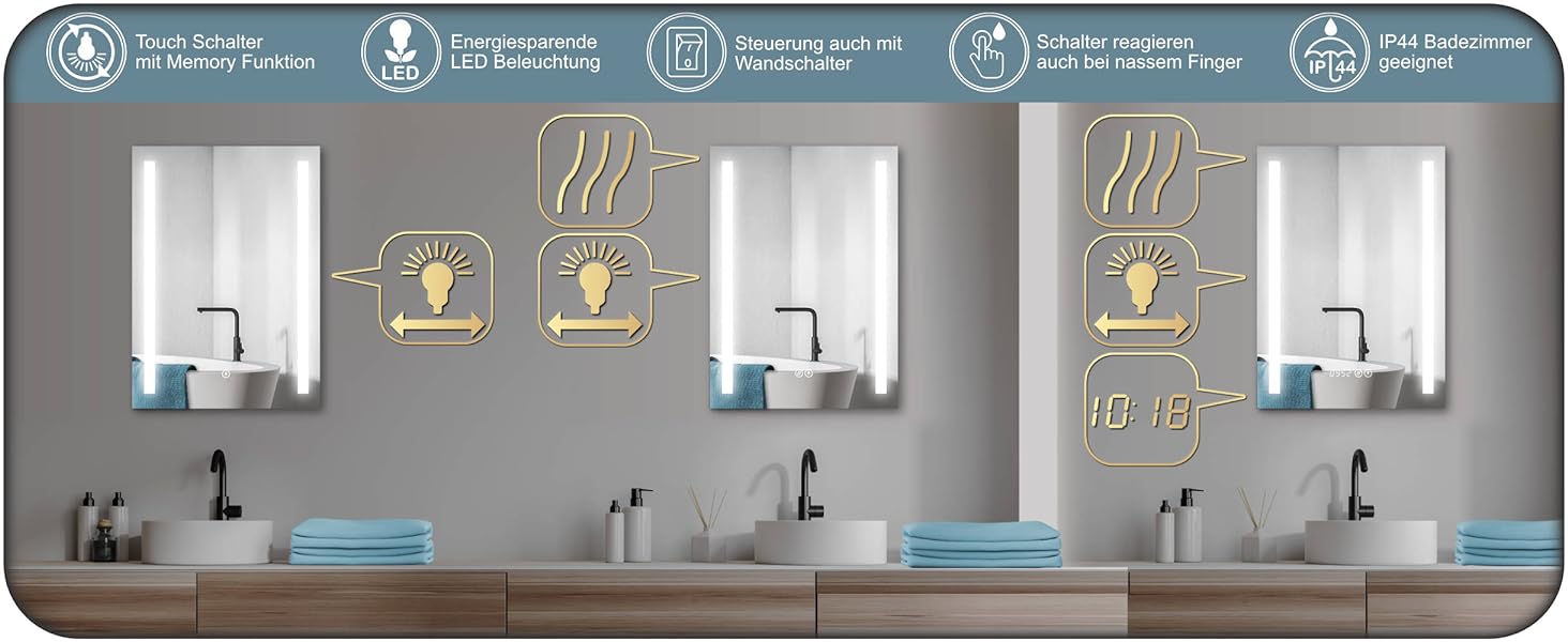 z ogrzewaniem lustrzanym zapobiegającym zaparowaniu, designerskie lustro łazienkowe z włącznikiem dotykowym + zmiana LED, ciepła biel, zimna biel, [Klasa energetyczna F]