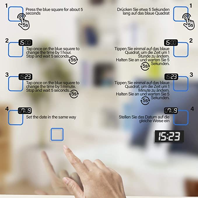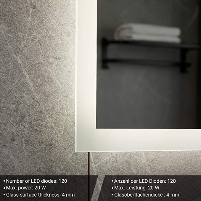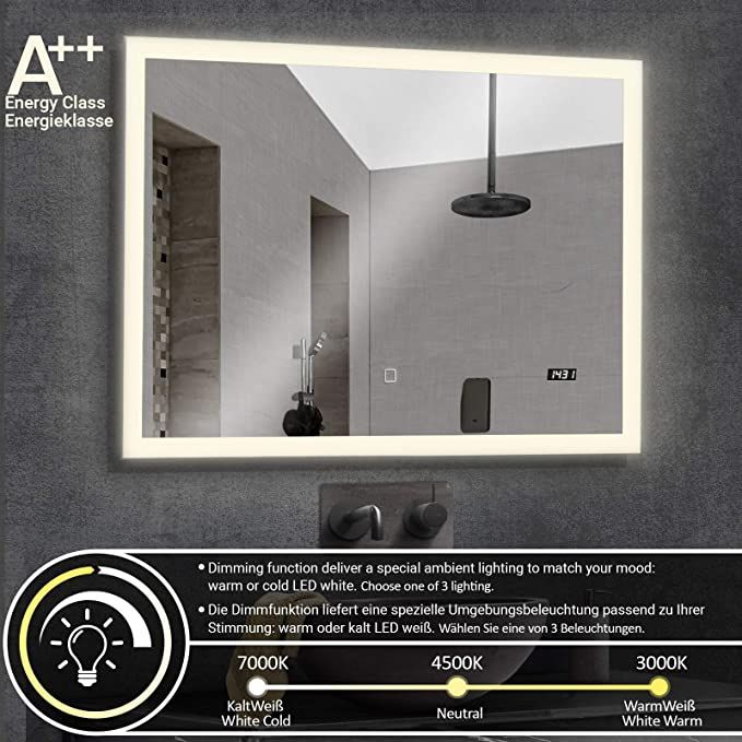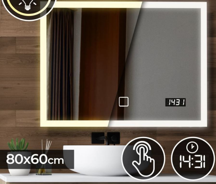 Te podświetlane lustra łazienkowe są wyposażone w zegar cyfrowy. Lusterko sterowane dotykiem zapewnia specjalne nastrojowe oświetlenie dopasowane do Twojego nastroju. Możliwość nastawienia od ciepłego do zimnego światła. To lustro nie zawiera miedzi i jest szczególnie odporne na wilgoć.