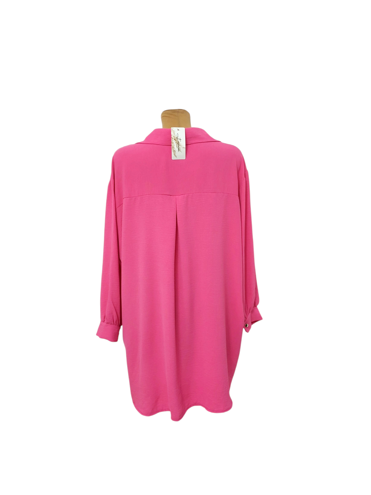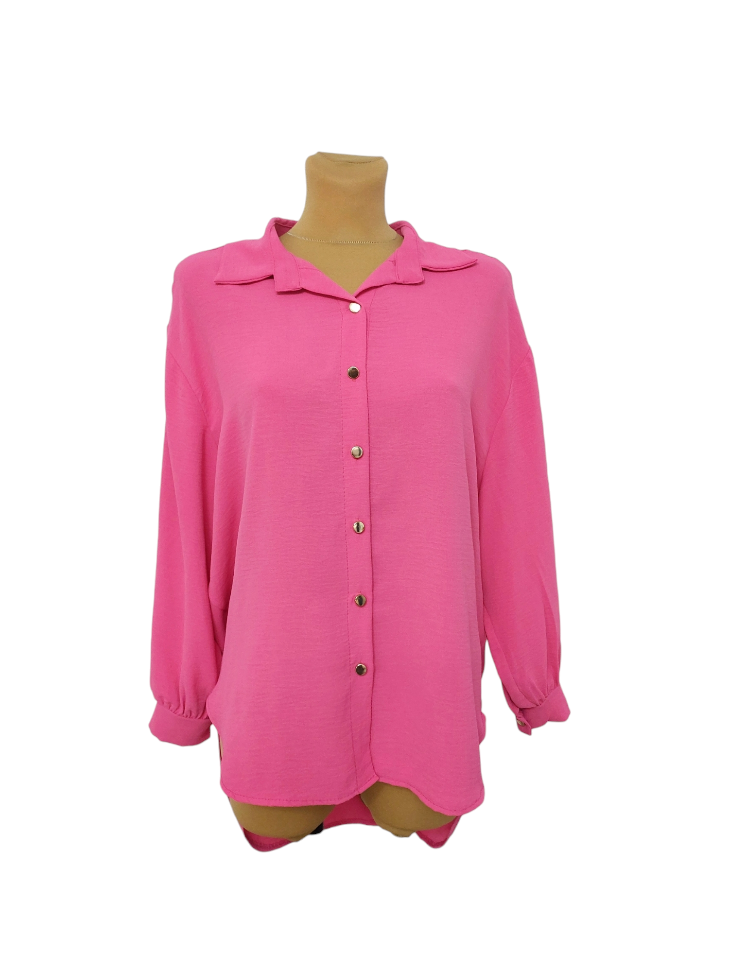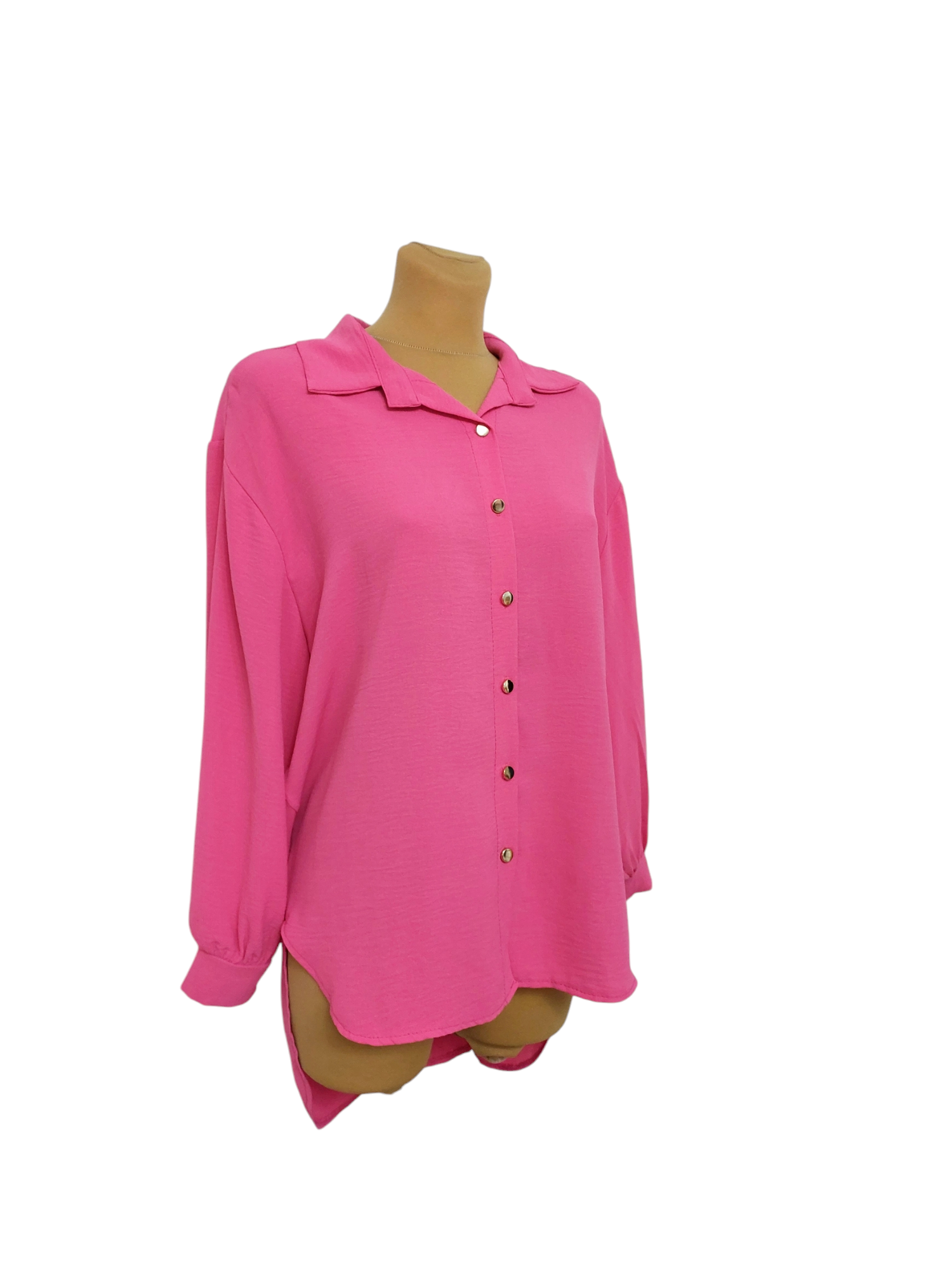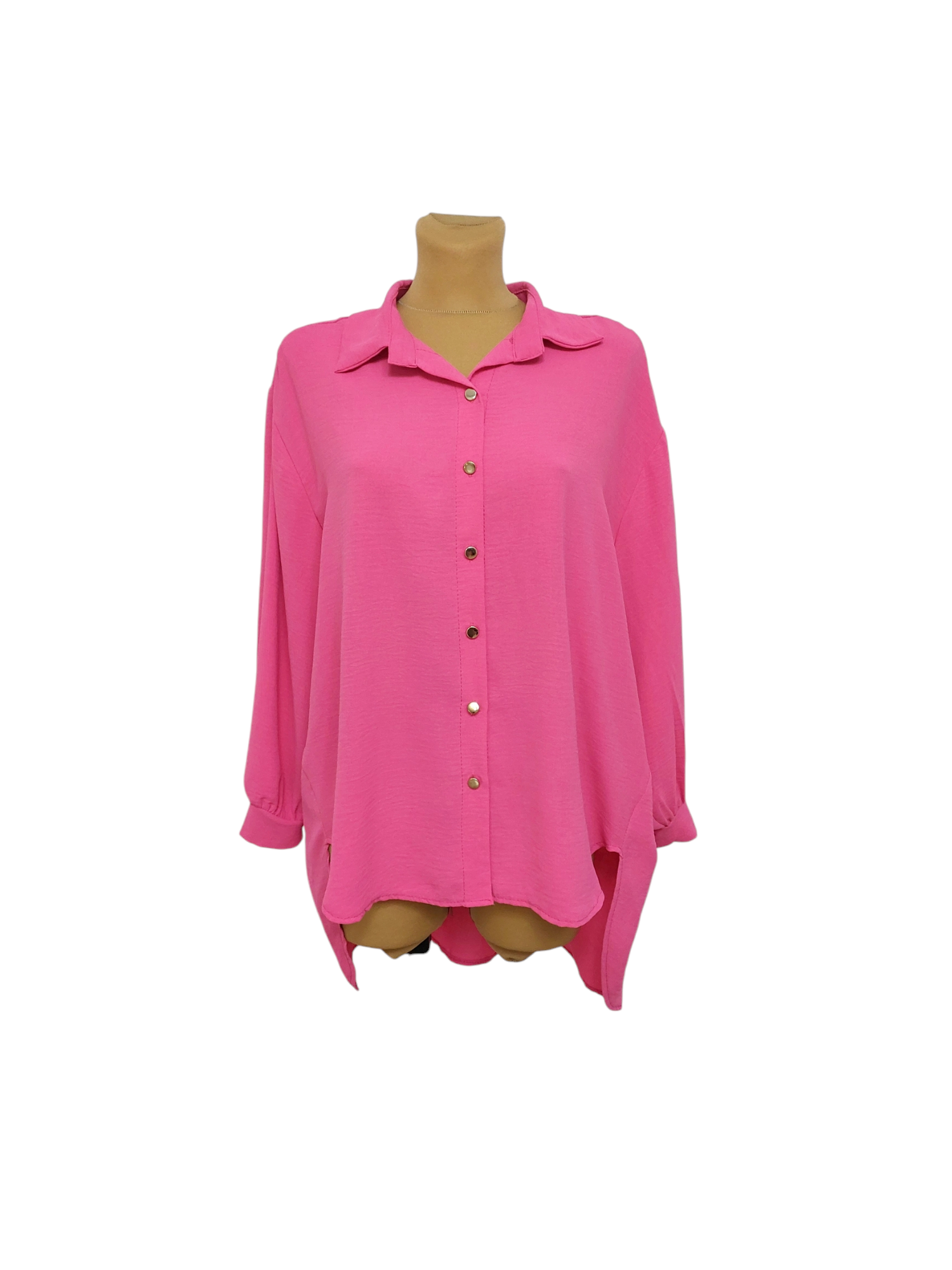 Lekka koszula z dłuższym tyłem to z pozoru klasyczny model jednakże urozmaicony oryginalnym krojem dołu. Zwiewna, przyjemna w dotyku tkanina pozwala skórze oddychać, dzięki czemu będziesz się niej czuła komfortowo przez cały dzień. Z przodu posiada klasyczne zapięcie na rząd złotych guzików oraz elegancki kołnierzyk.