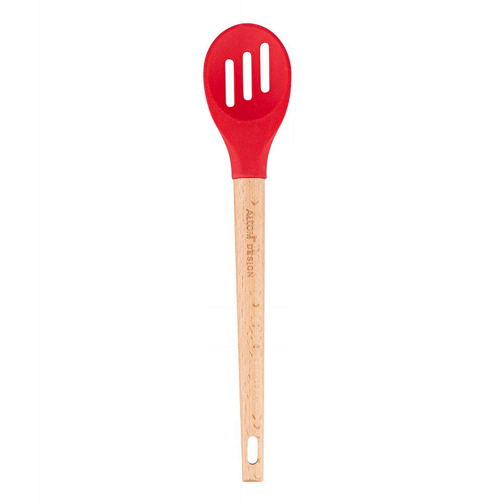 Łyżka ażurowa silikonowa z drewnianym uchwytem czerwona