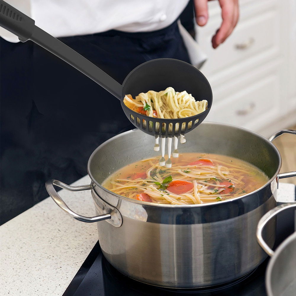 Posiada krawędź cedzącą oraz możliwość zawieszenia - Chochlę można zawiesić na relingu kuchennym lub przechowywać w szufladzie. Dodatkowo wyposażona w cedzak umieszczony z boku, co umożliwia wygodne odcedzanie warzyw z bulionu, a także mięsa z sosu. Długi uchwyt zapewni wygodne trzymanie oraz łatwe serwowanie zupy i potraw.