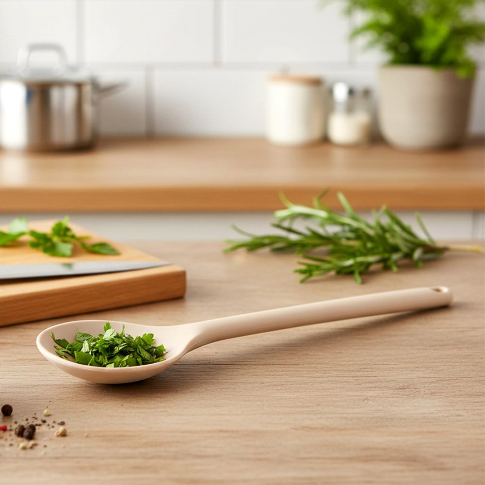 Silikonowa łyżka kuchenna przydatna w każdej kuchni. Solidnie wykonana z wytrzymałego materiału. Niezbędna w kuchni podczas przygotowywania pysznych dań. Ma szerokie zastosowanie. Idealna do mieszania, przewracania oraz nakładania przygotowanych potraw. Łatwa w czyszczeniu - silikon nie chłonie zapachów, nie nasiąka płynami. Posiada klasyczny wygląd, dzięki czemu wpasuje się zarówno do tradycyjnego, jak i nowoczesnego wnętrza.