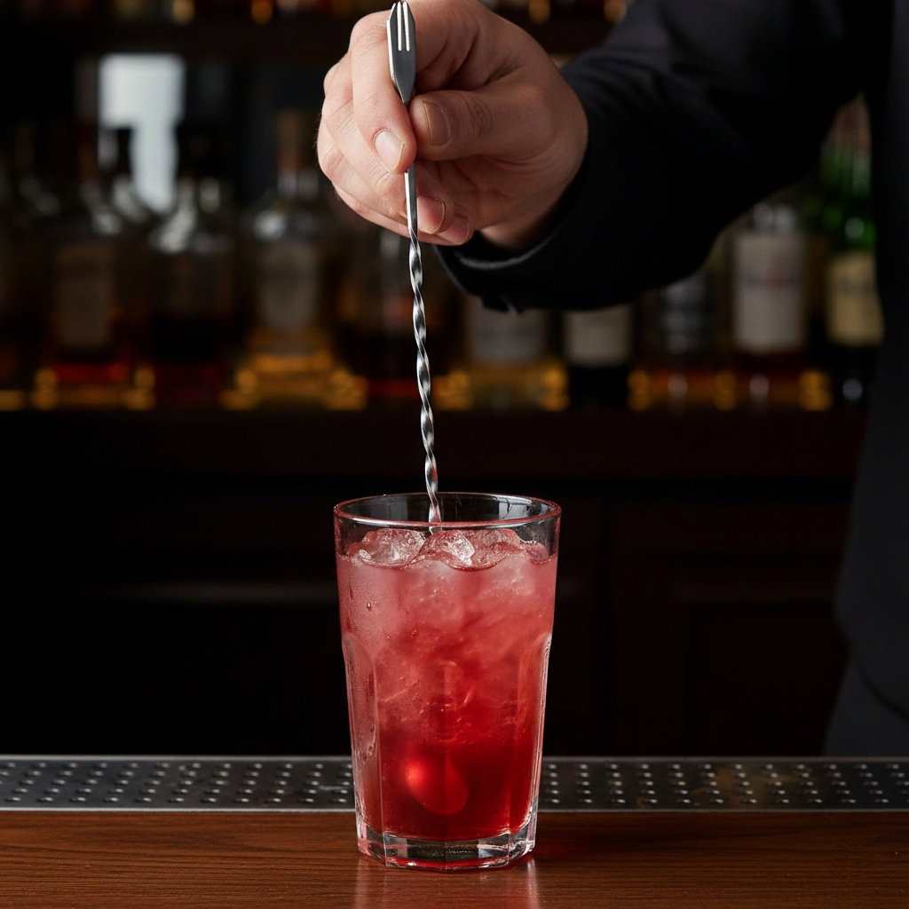 - Skręcona rękojeść: Charakterystyczny splot nie tylko wygląda efektownie, ale ułatwia mieszanie warstwowe koktajli oraz sprawia, że łyżka pewnie leży w dłoni, nawet gdy jest mokra.