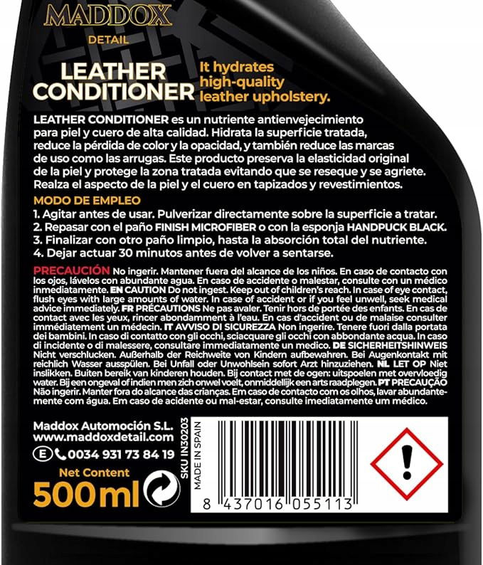 - ZADBAJ O SKÓRĘ SWOJEGO SAMOCHODU - Maddox Detail Leather Conditioner to wysokiej jakości odżywka przeciwstarzeniowa. Nawilża i zachowuje pierwotną elastyczność skóry, chroniąc ją przed wysuszeniem i pękaniem.