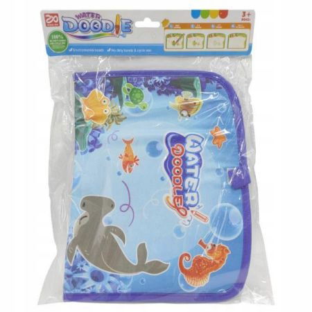 Mata do rysowania wodą. Dziecko może tworzyć mazakiem rysunki, odbijać na macie swoje dłonie lub namoczone stemple. Jedyne co trzeba zrobić to wypełnić czystą wodą specjalny flamaster. Napełniamy pisak wodą, rysujemy nim po macie, a rysunki po chwili „magicznie” znikają i Twoje dziecko będzie mogło rozpocząć tworzenie nowego dzieła. Mata wykonana jest z przyjemnego w dotyku materiału, dzięki czemu wygląda estetycznie po wielu użęciach, a utrzymanie jej w czystości jest niezmiernie proste. Można ją również łatwo złożyć i przetransportować. Mata jest wielokrotnego użytku. Mata posiada zamknięcie na rzep, mata-książeczka jest idealną zabawką do zabrania w podróż. W zestawie: -mata do rysowania, -mazak