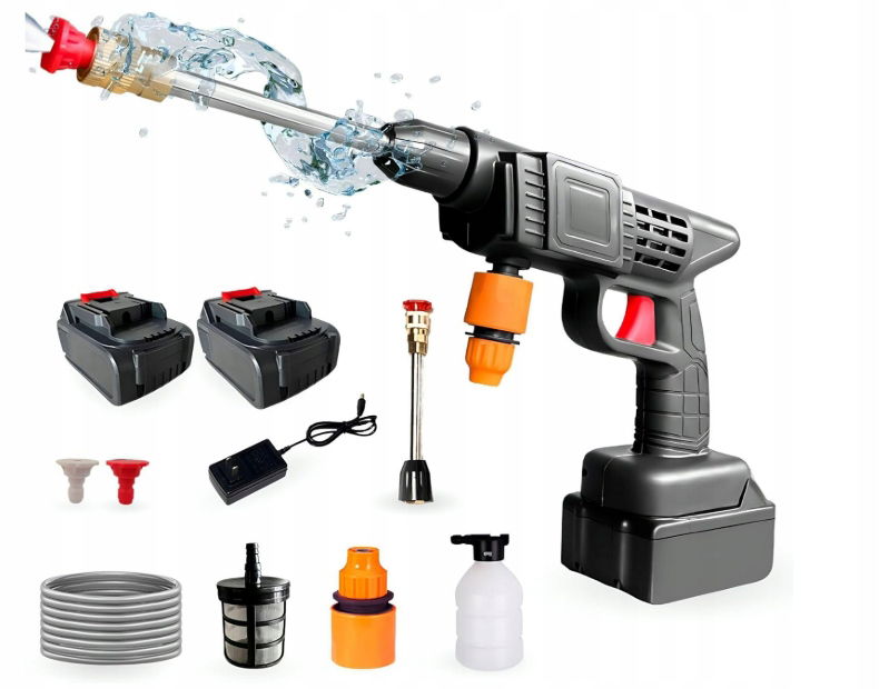 Magic Select bezprzewodowa myjka ciśnieniowa ⚡ to wszechstronne urządzenie do mycia samochodu �, roweru ?, okien ?, tarasu ? czy mebli ogrodowych. Wyposażona w 300W miedziany silnik ? o ciśnieniu roboczym 35 bar / 500 PSI, pozwala na strumień wody do 4 l/min i zasięg do 10 m ?. W zestawie: 2 akumulatory 48V, 5 m wąż, 3 dysze, filtr wody, pojemnik na detergent oraz ładowarka ?.
