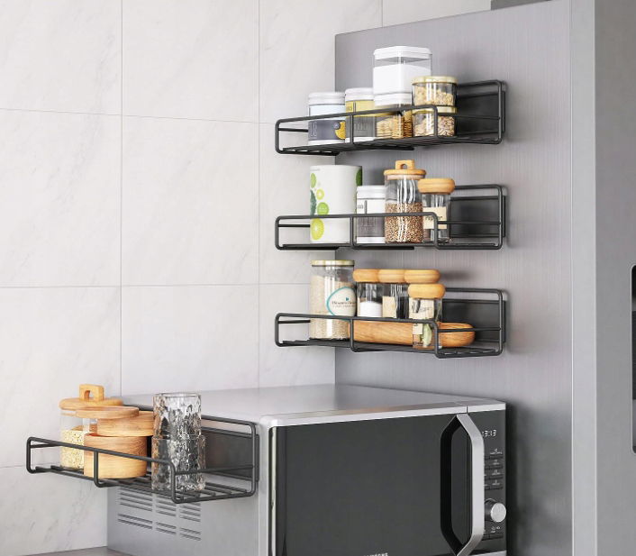 - Magnetyczny montaż: Półki mocuje się bezpośrednio do lodówki lub innej metalowej powierzchni za pomocą mocnych magnesów. Nie potrzebujesz żadnych narzędzi ani wiercenia otworów.