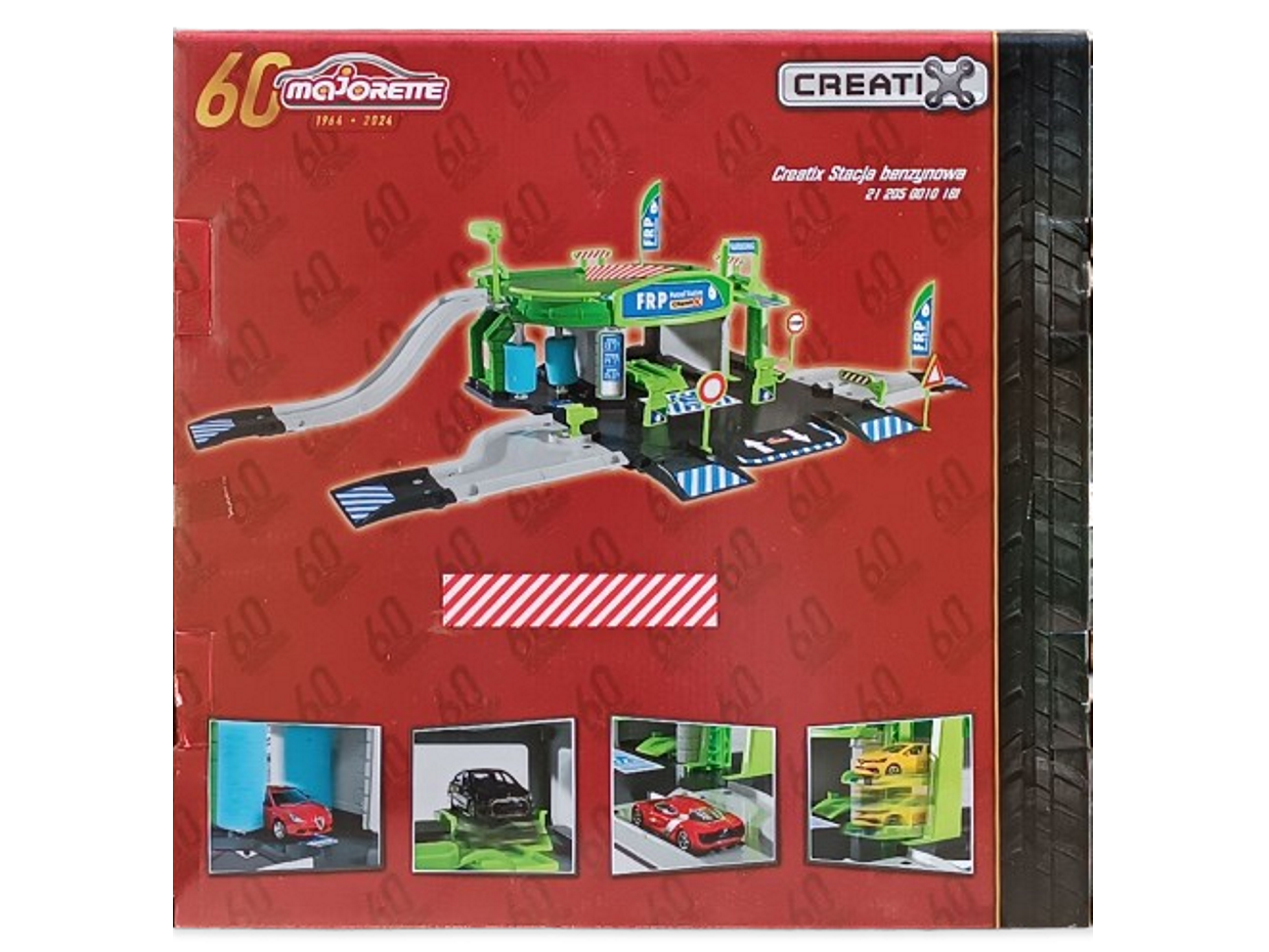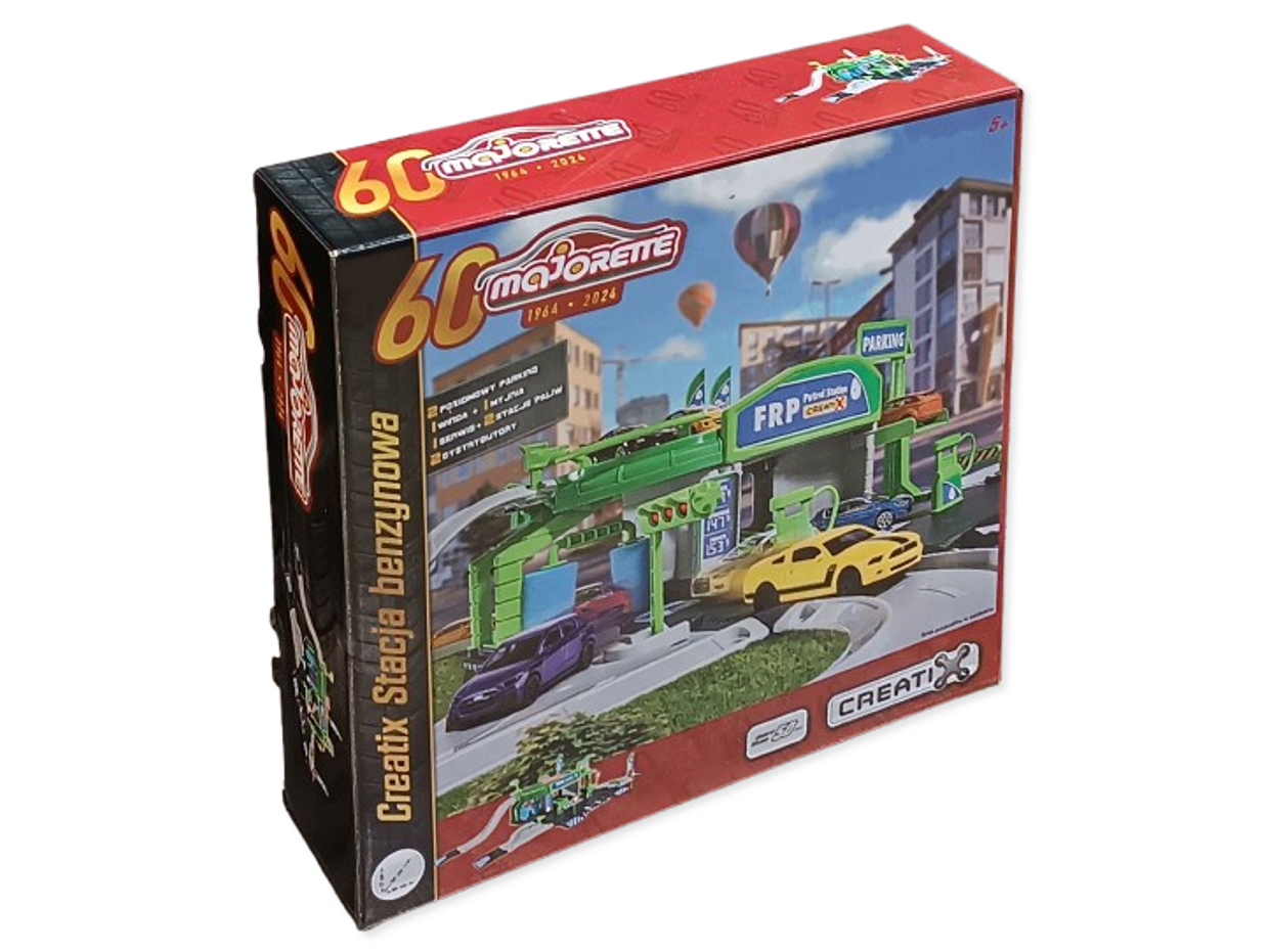 Plastikowy dwu poziomowy parking marki Majorette z myjnią i stacją benzynową, który po złożeniu osiąga wymiary 17x39x64cm. Zabawka wykonana jest z tworzywa sztucznego, posiada certyfikat CE i jest przeznaczona dla dzieci powyżej 5 roku życia. Zabawka rozwija kreatywność dziecka oraz pobudza jego wyobraźnię. Interaktywna zabawa, pozwala zdobyć dziecku wiedzę na temat samochodów, ruchu drogowego i funkcjonowania parkingu, myjni i stacji benzynowej. Zestaw zawiera 2 poziomowy parking, windę, myjnię, serwis, stację benzynową z dwoma dystrybutorami. Autka widocznie na opakowaniu nie są częścią zestawu.