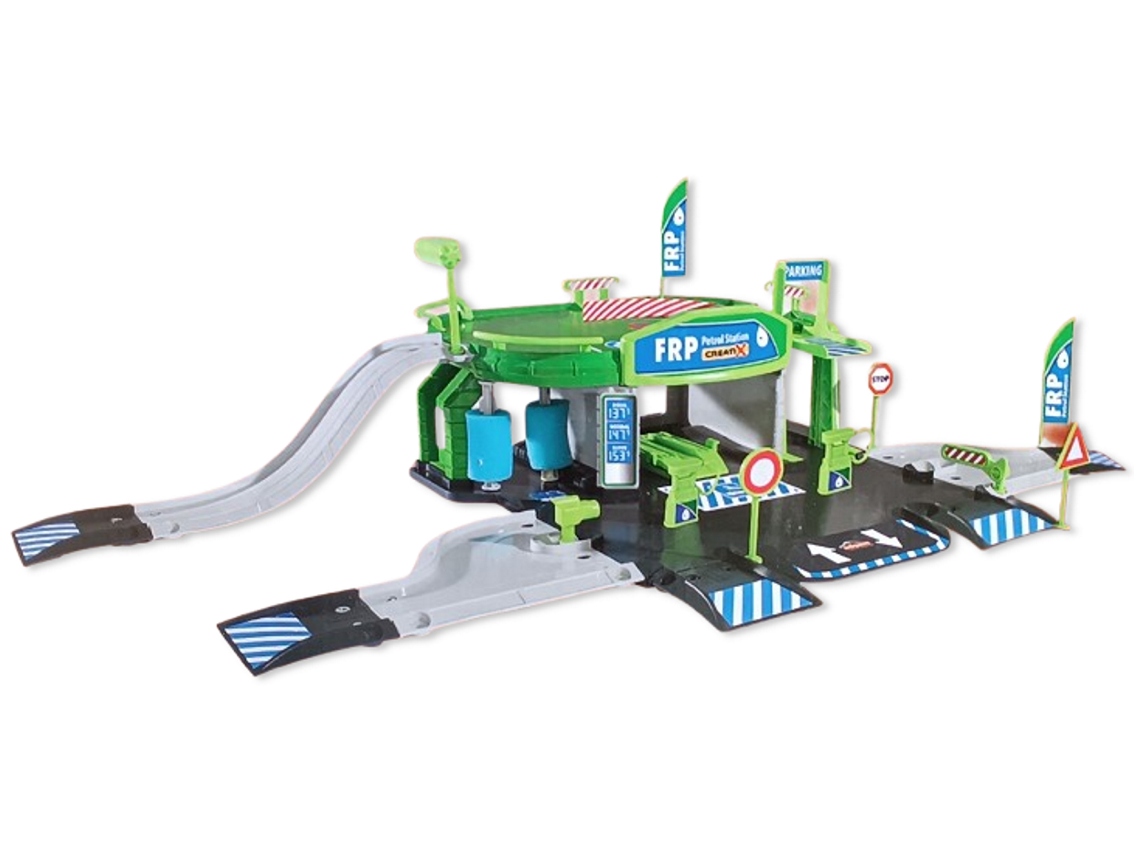 1x Plastikowy 2 poziomowy parking do złożenia (z windą, stacją benzynową, myjnią i serwisem)