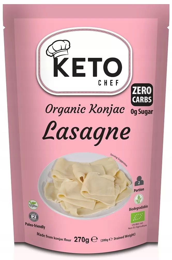 Makaro Konjac Lasagne od Keto Chef wyprodukowany jest z korzenia konjac. Jest bez glutenu i cukru. Nie zawiera węglowodanów, dzięki czemu