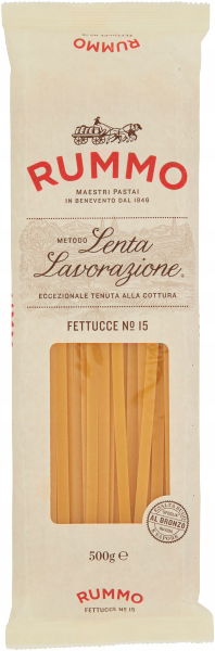 Makarony Rummo to oryginalne włoskie makarony. Historia marki rozpoczęła się w 1846 roku w Benevento, niedaleko Neapolu, kiedy to rodzina Rummo zaczęła mielić lokalne zboże i wyrabiać makaron. Do wyrobu makaronów Rummo wykorzystuje wyłącznie wysokiej jakości semolinę z pszenicy twardej durum i wytłacza makarony w formach z brązu. Zgodnie z motto firmy: "Bez pośpiechu do doskonałości”, makaron podlega procesowi powolnego wyrabiania według opatentowanej metody Lenta Lavorazione, dzięki której zachowane są właściwości semoliny. Makarony Rummo mają wysoką zawartość białka - aż 14,5% na 100g i po ugotowaniu pozostają al dente, czyli półtwarde. To oznacza, że podczas gotowania chłoną mniej wody, co powoduje dłuższy proces jedzenia makaronu, a tym samym łatwiej się go trawi i jest bardziej sycący. W przygotowanym daniu liczy się nie tylko jego smak, ale także to jak się prezentuje na talerzu. Makaron Rummo nawet po dwukrotnym ugotowaniu lub podgrzaniu jest sprężysty, nie skleja się, a sos z niego nie spływa.