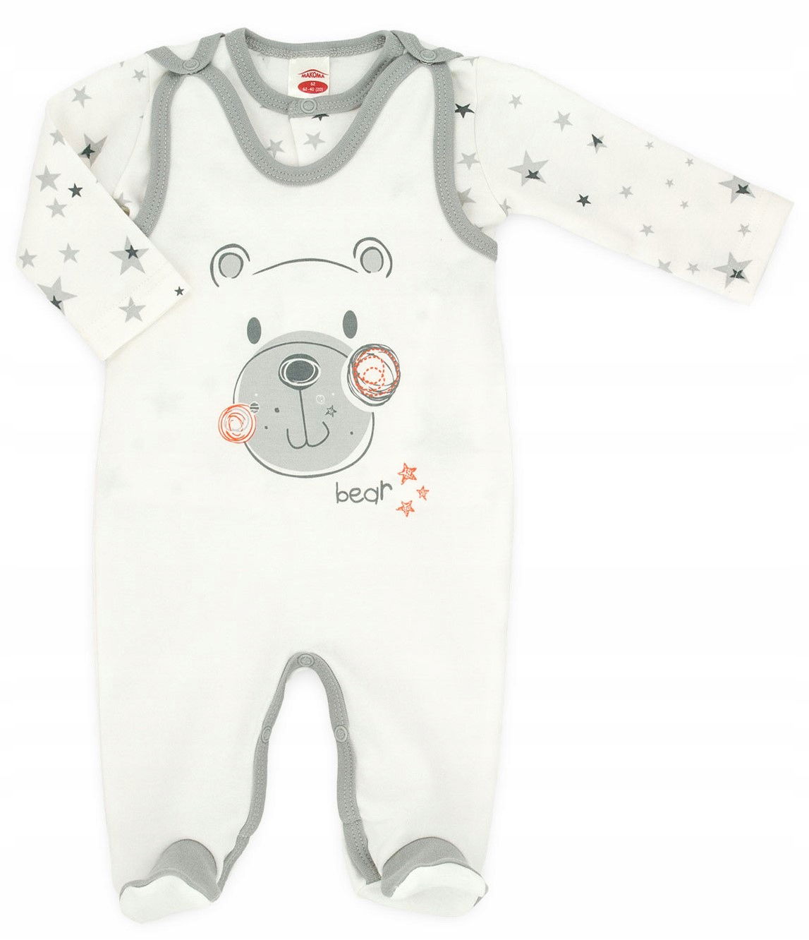 Uszyty z wysokogatunkowego, przyjemnego w dotyku materiału. Śpiochy zapinane na ramieniu oraz w kroku na bezniklowe napy. Kaftanik zapinany na bezniklowe napy.
