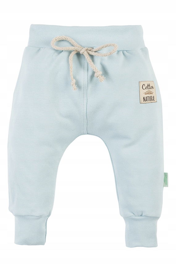 Spodnie niemowlęce w kolorze miętowym z ozdobnym sznureczkiem. Spodnie wykończone w pasie szeroką gumą. Jej zadanie polega na utrzymaniu ubranka na właściwym miejscu, bez zbędnego uciskania brzuszka dziecka.