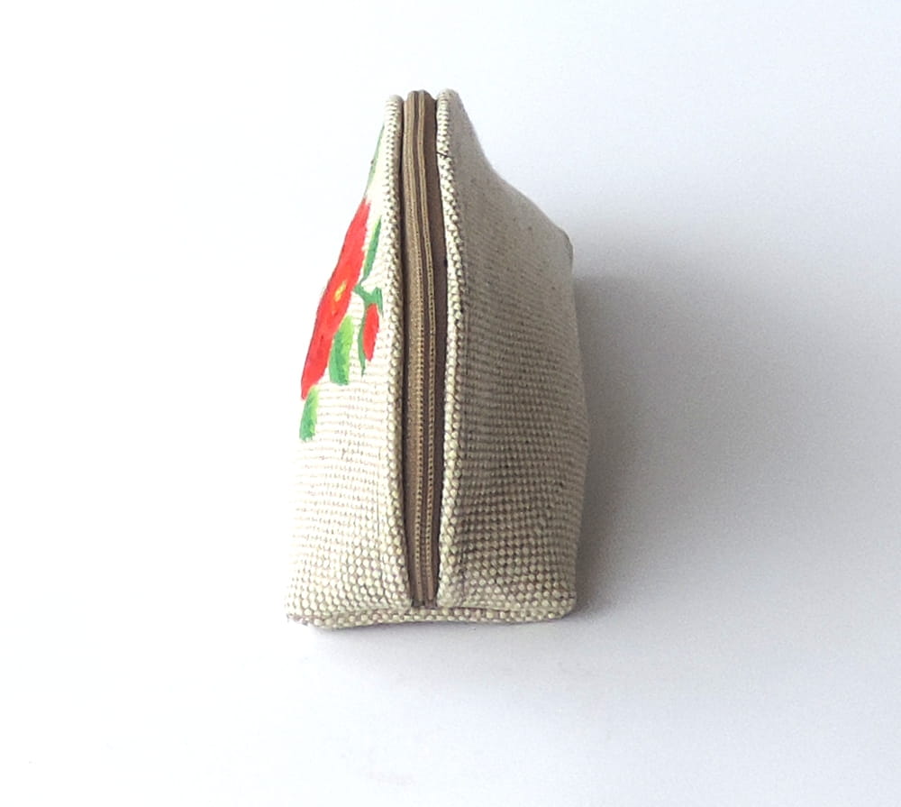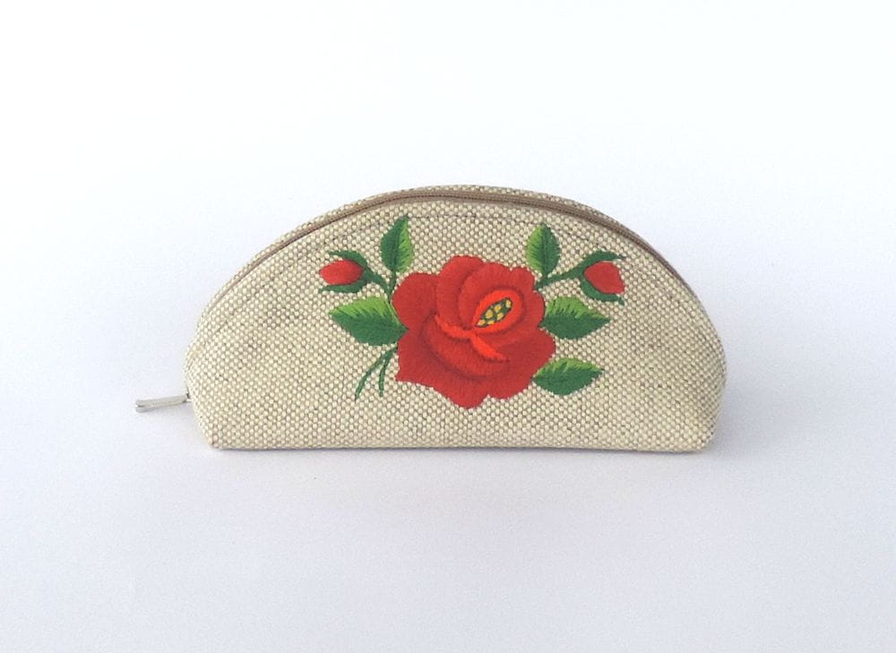 Przepiękny haft zdobiący kosmetyczkę przedstawia jeden z wielu tradycyjnych motywów łowickiej sztuki ludowej (czerwona róża).