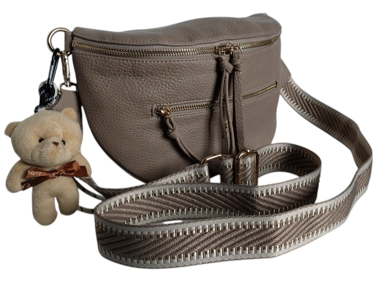 Mała Nerka Damska na Ramię z Zawieszką, Torebka Damska, 2 Paski, Ciemny Beż