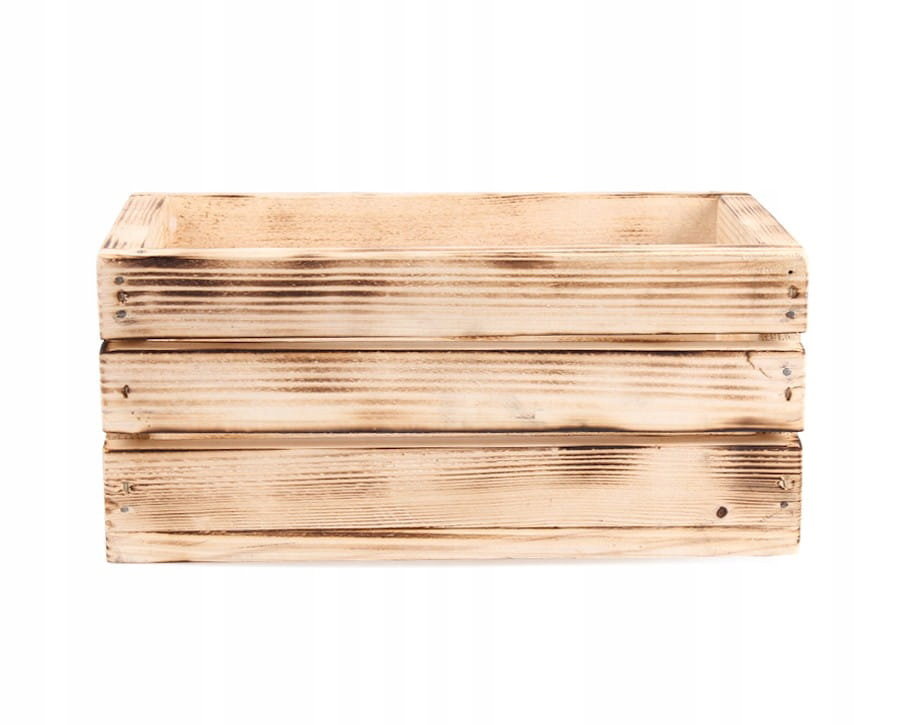 Skrzynka jest opalana, dzięki czemu sęki i struktura drewna są podkreślone. Rośliny na takim tle prezentują się jeszcze lepiej.