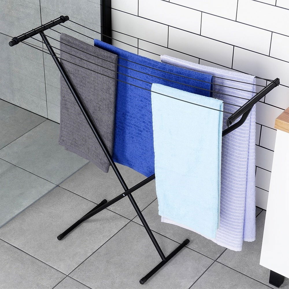 Suszarka na pranie składana na płasko. Suszarka wykonana z solidnych materiałów, utrzymana w modnej, czarnej kolorystyce. Dzięki funkcji składania suszarka po złożeniu nie zajmuje dużo miejsca. Niezbędna w każdym domu. Odpowiednio użytkowana posłuży długie lata.