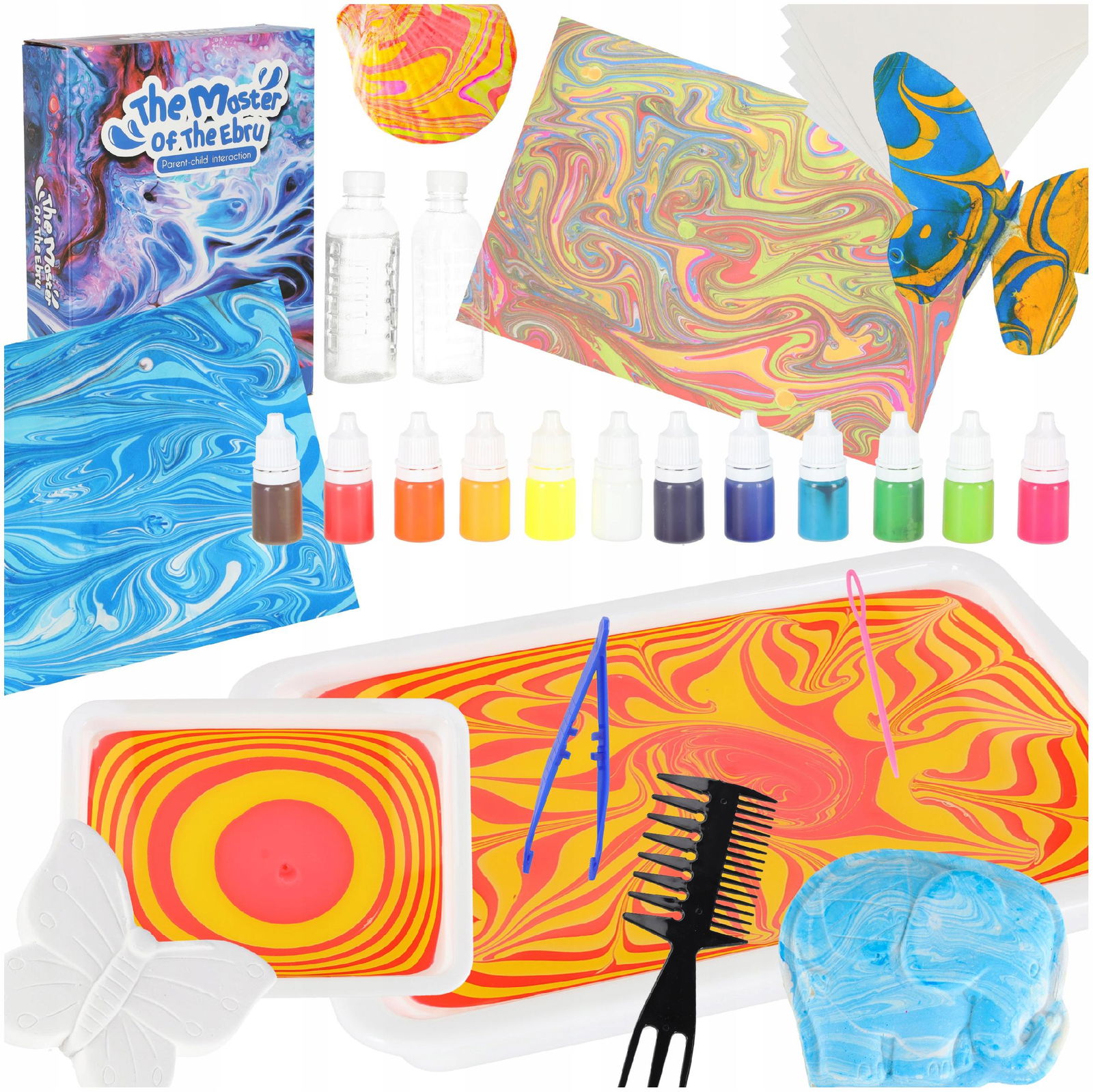 W zestawie m.in. tacka A5, 40 arkuszy papieru, pigmenty, pipety, grzebień i figurki gipsowe.