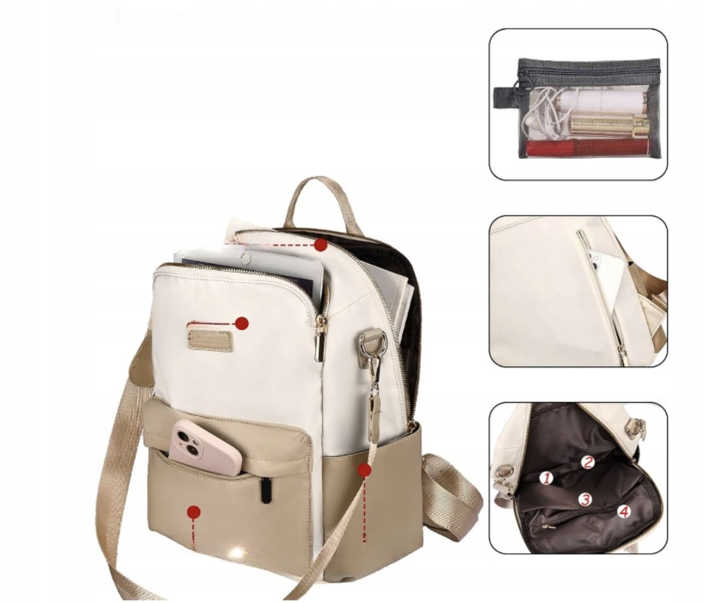- Kieszenie: 4 wewnętrzne przegródki, 1 kieszeń antykradzieżowa z tyłu, 2 kieszenie boczne, 2 kieszenie z przodu, 1 komora główna