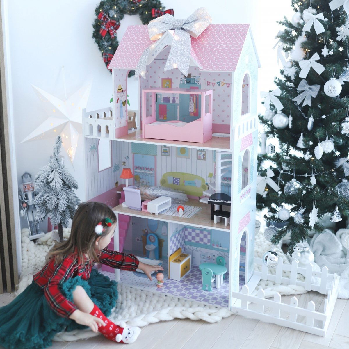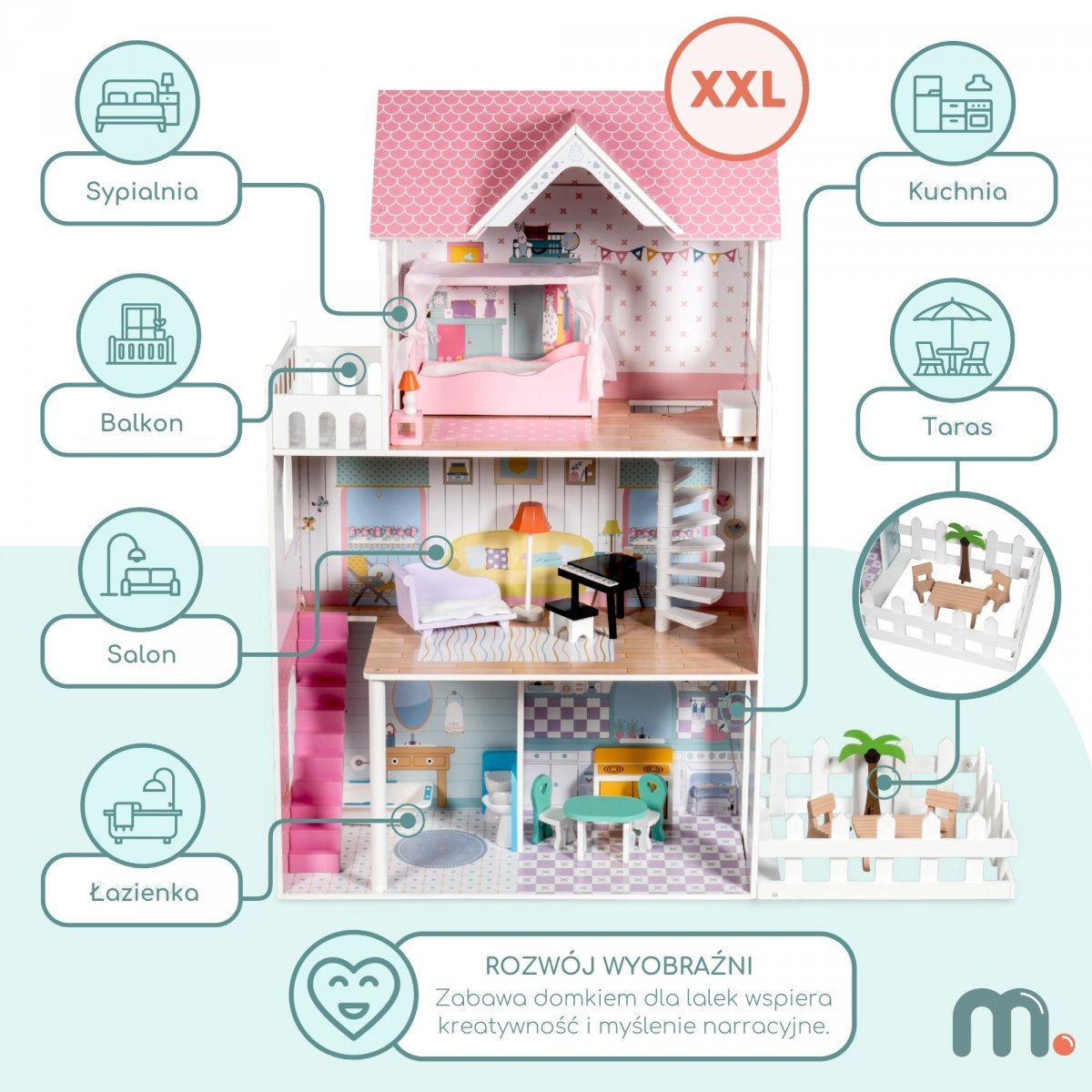 Domek ma 3 niezależne poziomy na każdym znajdują się inne pomieszczenia. Dodatkowo zabawkę wyposażono w piękny taras oraz ogródek. Każda dziewczynka marzy o takim wspaniałym domu dla swoich lalek!