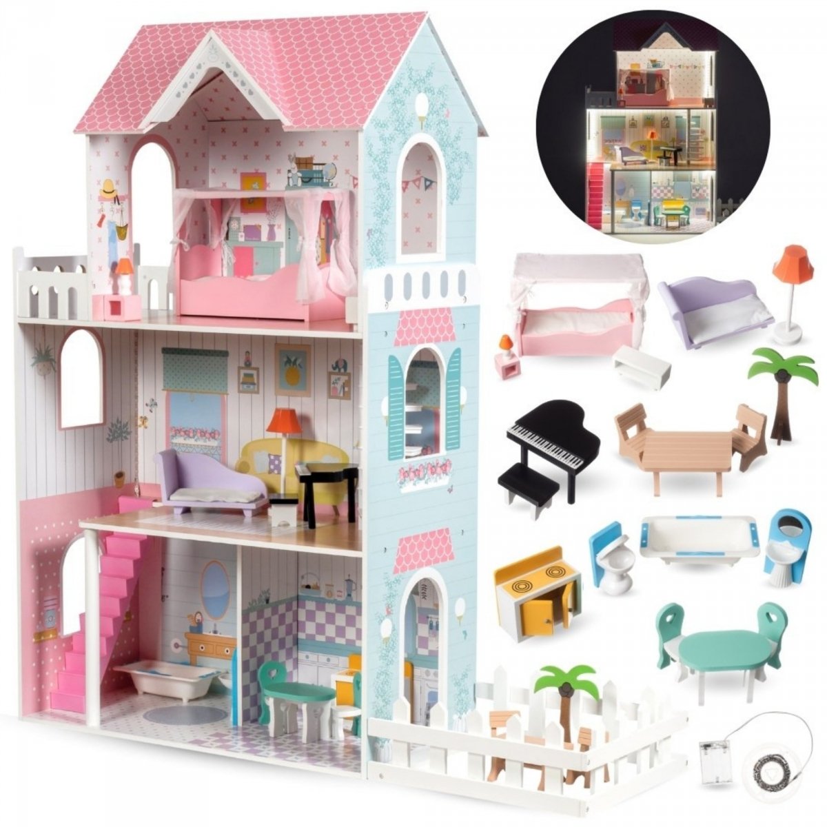 Mamabrum drewniany domek dla lalek XXL - 123 cm - podświetlany LED