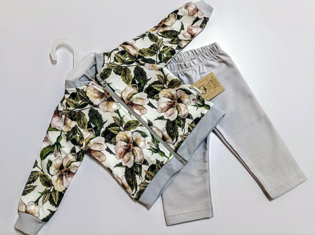 Uszyty z wysokogatunkowego, miękkiego i przyjemnego w dotyku materiału. Bluza rozpinana po całości, przez środek na zamek błyskawiczny. Spodenki posiadają elastyczny ściągacz w pasie nie uciskający brzuszka dziecka.