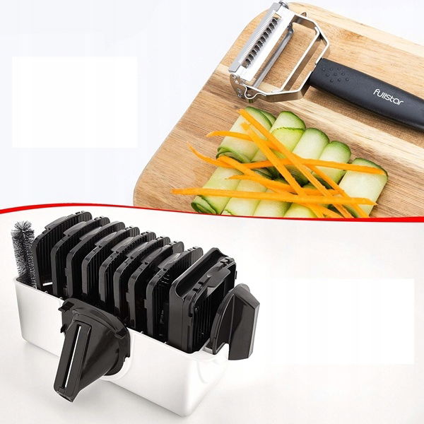 - To wszechstronne urządzenie kuchenne zastępuje wiele innych akcesoriów, oferując aż 11 różnych funkcji krojenia, tarcia i szatkowania warzyw, owoców czy sera za pomocą wymiennych ostrzy.