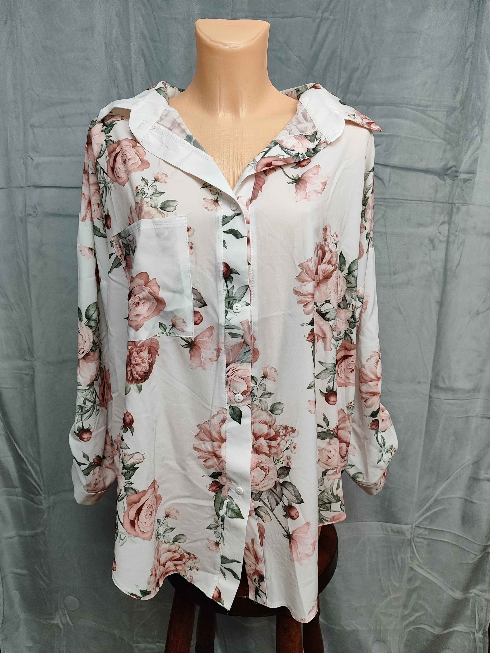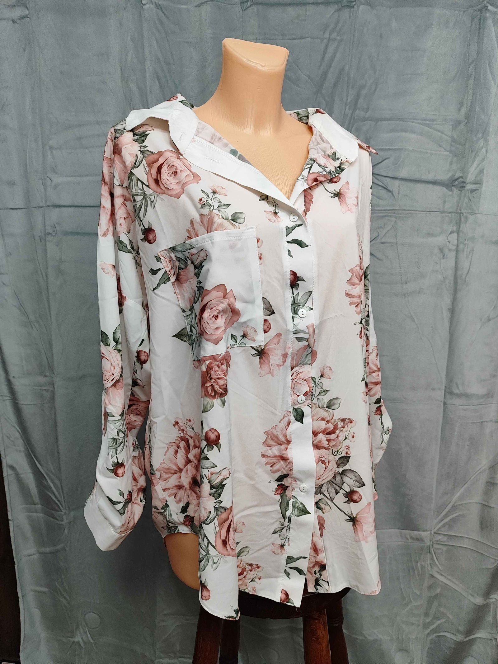 Stylowa koszula marki Manilla w rozmiarze XL z romantycznym motywem róż. Jasne tło i subtelne odcienie pudrowego różu oraz zieleni tworzą kobiecy, ponadczasowy wzór w klimacie boho / vintage.