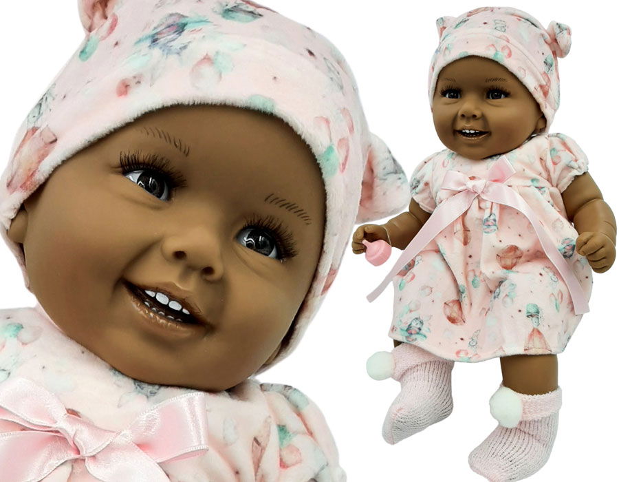Laleczka DianaRączki, nóżki i główka laleczki zostały wykonane z najlepszego, słodko pachnącego winylu. Natomiast tułów laleczki jest miękki.Laleczka wykonywana w całości ręcznie, w związku z tym ząbki mogą być lekko niedomalowane.Ubranko Diany zostało wykonane z wysokiej jakości, pluszowego materiału, który jest bardzo przyjemny w dotyku.Wysokość laleczki: 47 cmLaleczka Diana posiada:- sukienkę,- majteczki,- skarpetki,- czapeczkę,- pustą butelkę.Laleczka pakowana w woreczek.