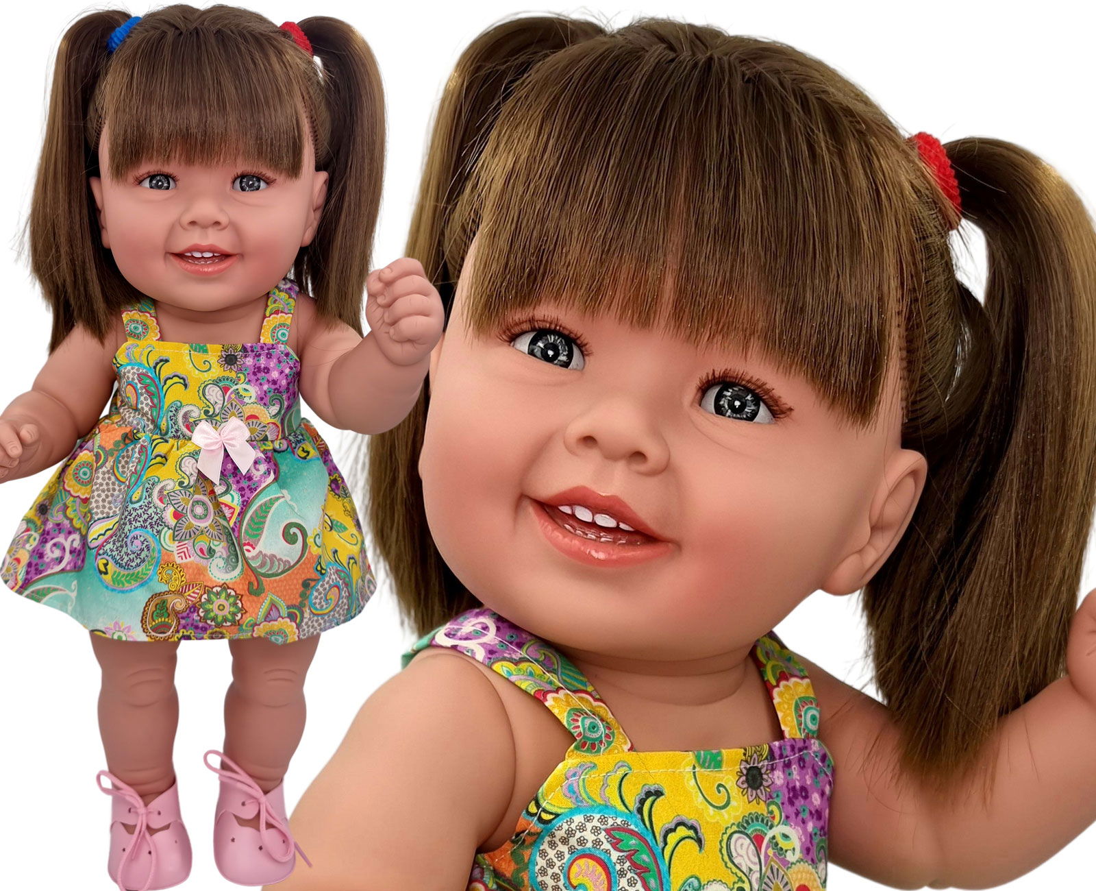 Laleczka Diana Laleczka w całości wykonana z najlepszej jakości, hiszpańskiego winylu. Laleczka wykonywana w całości ręcznie, w związku z tym ząbki mogą być lekko niedomalowane. Ubranko Diany zostało wykonane z wysokiej jakości materiału. Wysokość laleczki: 47 cm Laleczka Diana posiada: - sukienkę,- majteczki,- buty. Laleczka pakowana w woreczek.
