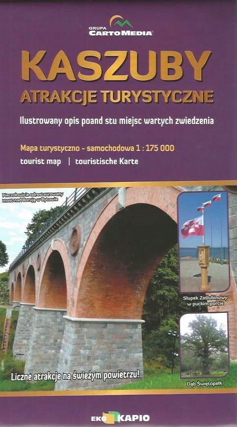 Bardzo interesująca i aktualna mapa na rok 2021, ciekawa forma poglądowa Kaszub z wyszczególnionymi największymi atrakcjami turystycznymi regionu. Idealna do zaplanowania sobie trasy i odbycia wycieczki po Kaszubach. Na odwrocie bogato ilustrowany opis poszczególnych atrakcji. Dodatkowo, strona z mapą posiada zaznaczone liczne pozostałe miejsca warte odwiedzenia a pominięte w opisach tylko ze względu na ograniczone miejsce. Piękne zdjęcia na pewno zachęcą do odwiedzenia licznych atrakcji Kaszub! Dodatkowo, jako ciekawostkę umieściliśmy orientacyjny zasięg nawałnicy z roku 2017. Skala: 1:75 000.