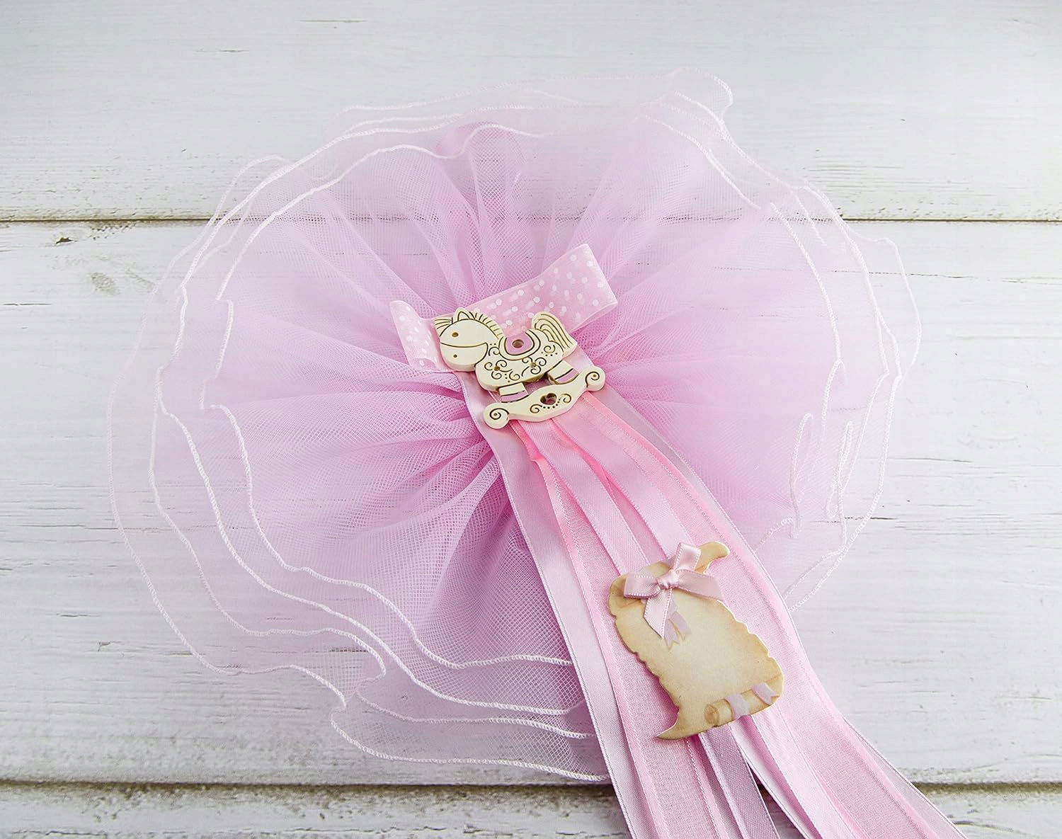 Wstążka urodzinowa z różowego tiulu z koniem na biegunach i pergaminem do opisywania dziecka, tasiemki i satynowej wstążki.