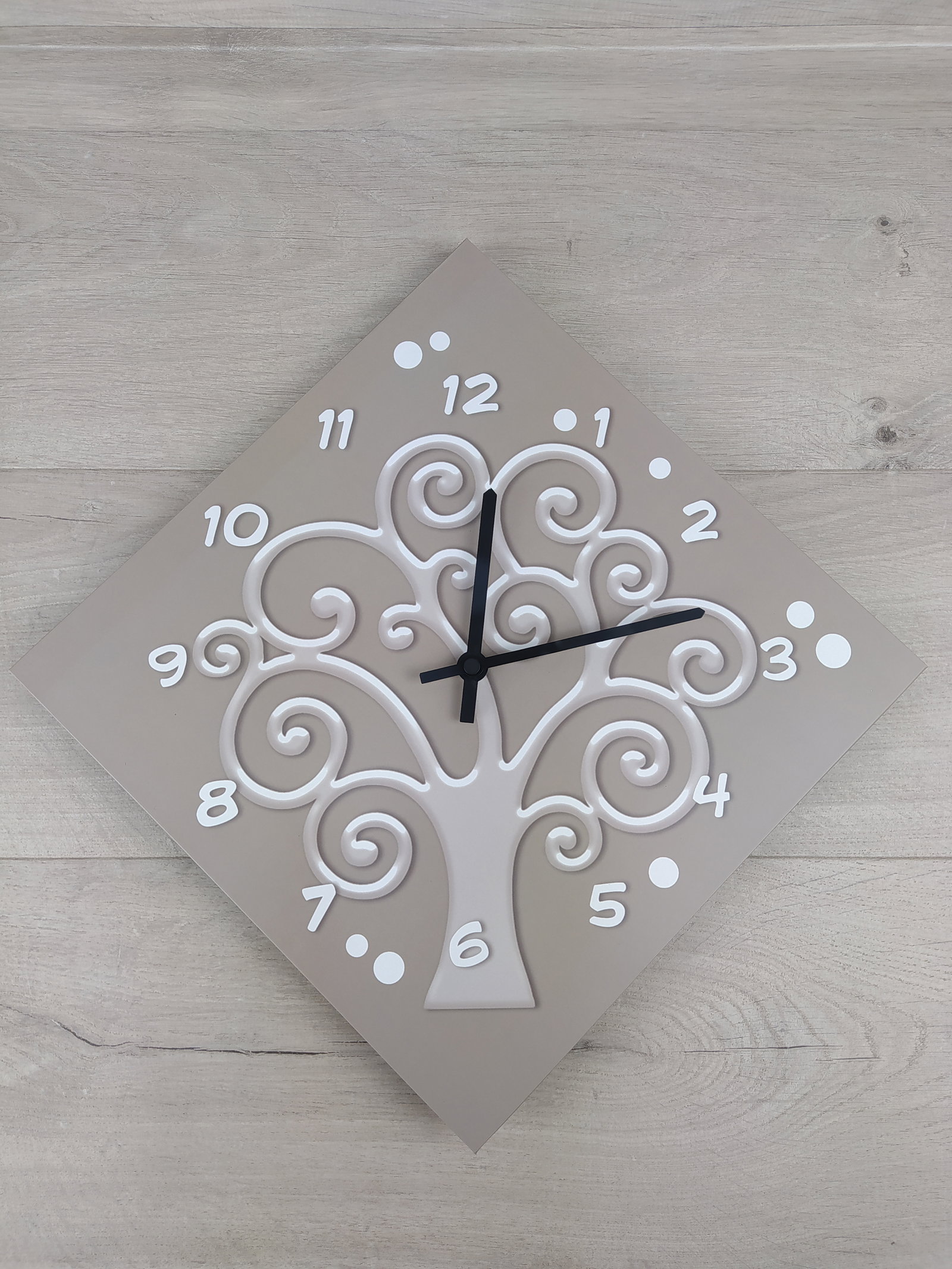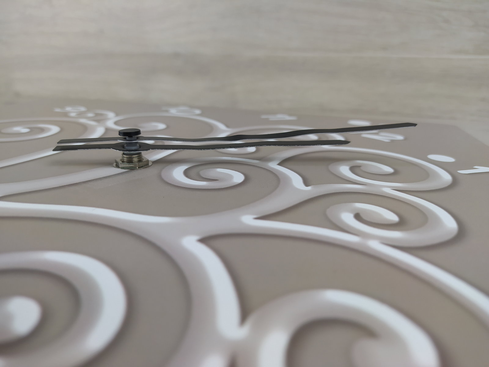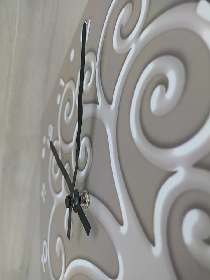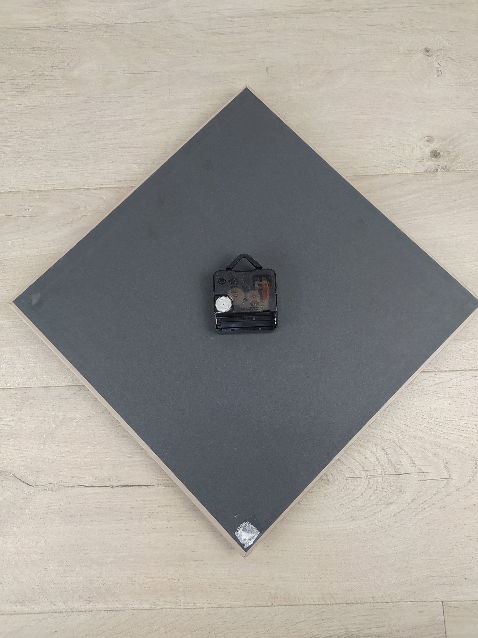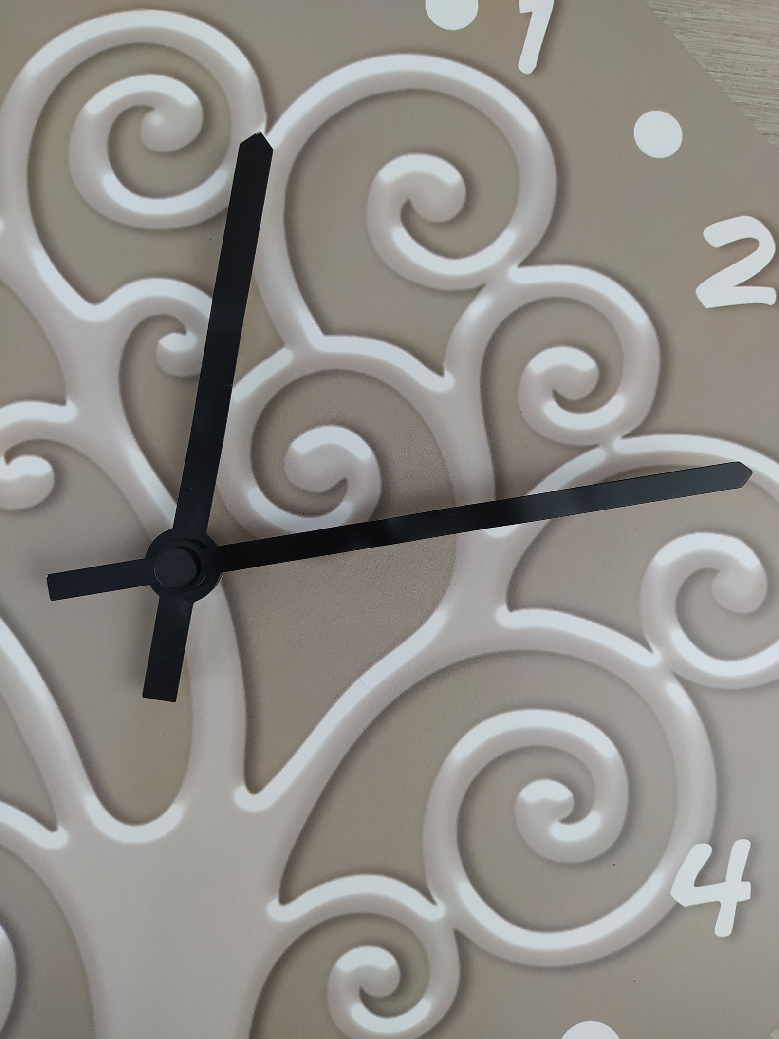 - Struktura tarczy ze sklejki 4 mm, drewno nie jest widoczne, lecz pokryte papierem z matowym laminowanym wykończeniem. Zegar jest gotowy do zawieszenia.