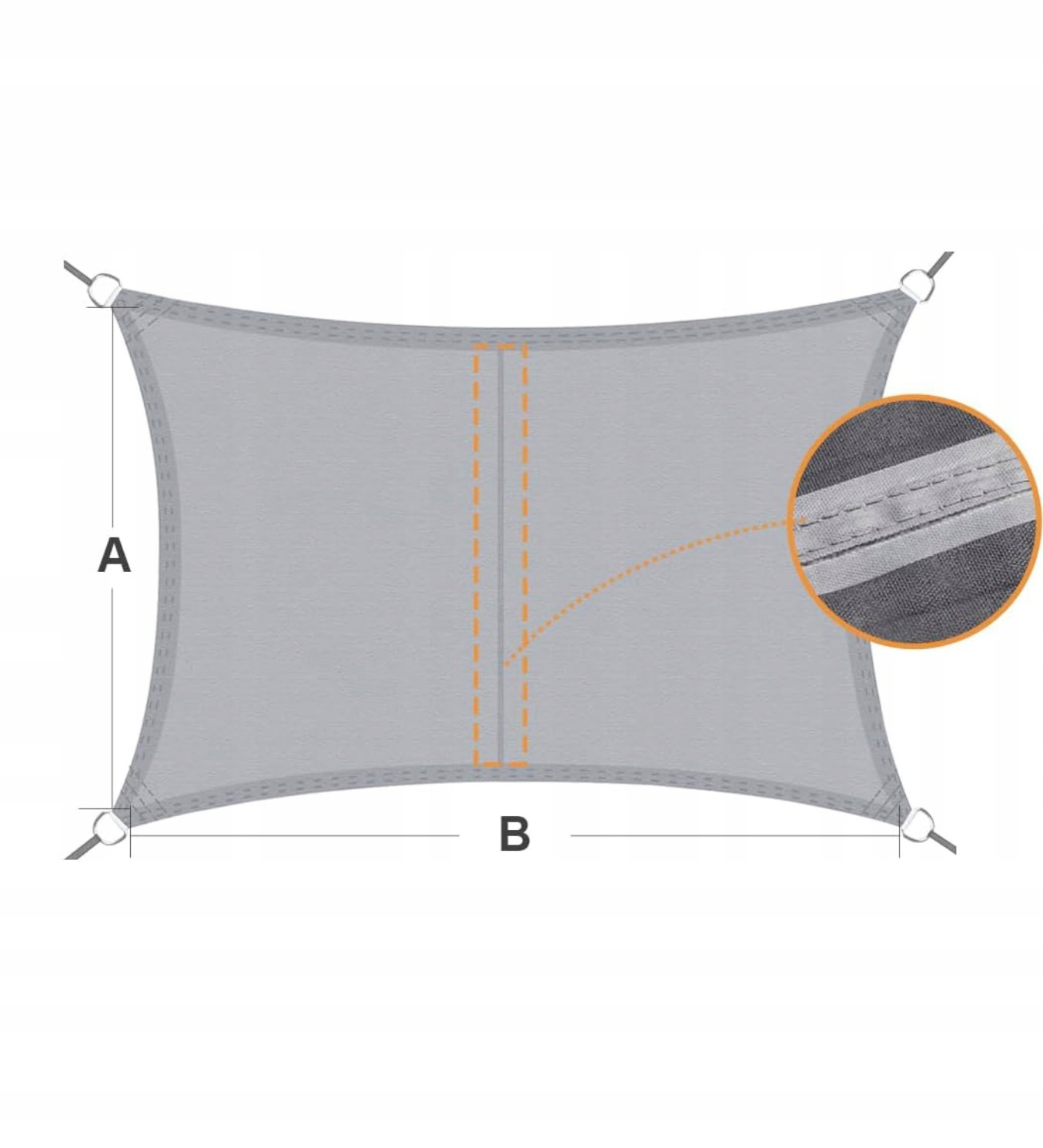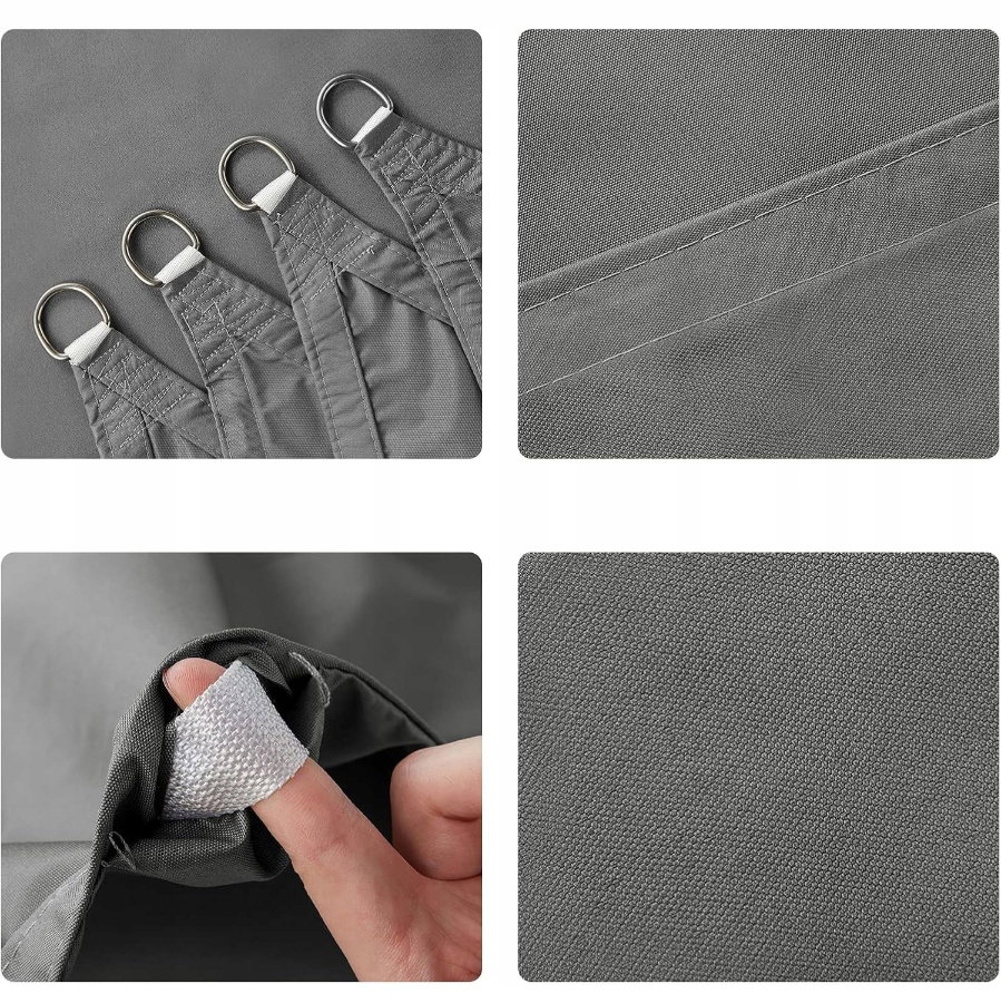 - Solidna konstrukcja: żagiel wyposażono w pierścienie montażowe ze stali nierdzewnej 304, które zwiększają wytrzymałość punktów mocowania. Krawędzie zostały dodatkowo wzmocnione taśmami oraz podwójnym przeszyciem, co zapobiega rozrywaniu materiału podczas naprężenia. Specjalna, lekko wklęsła konstrukcja pomaga równomiernie rozłożyć napięcie i utrzymać materiał w odpowiednim napięciu bez powstawania fałd.