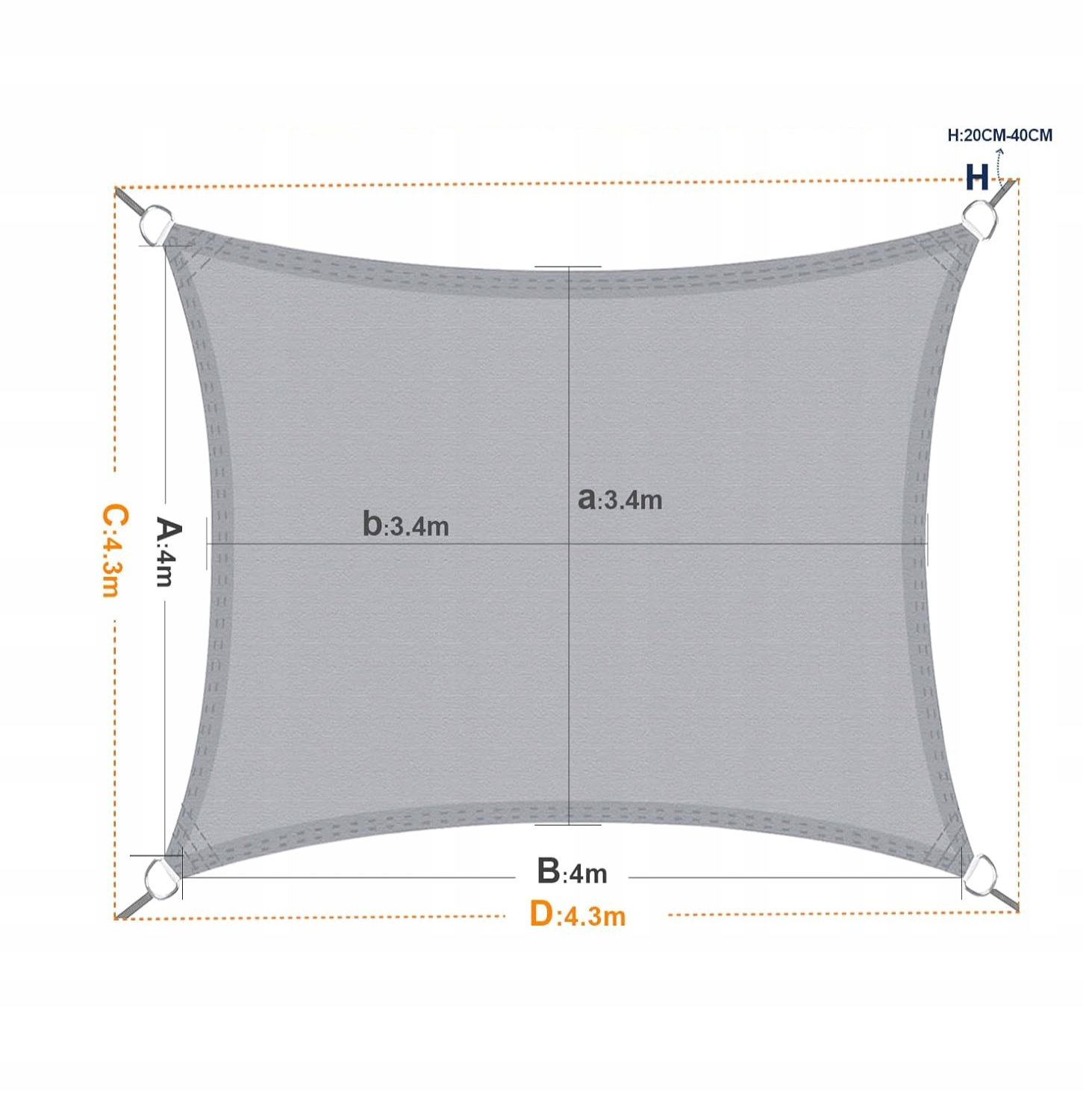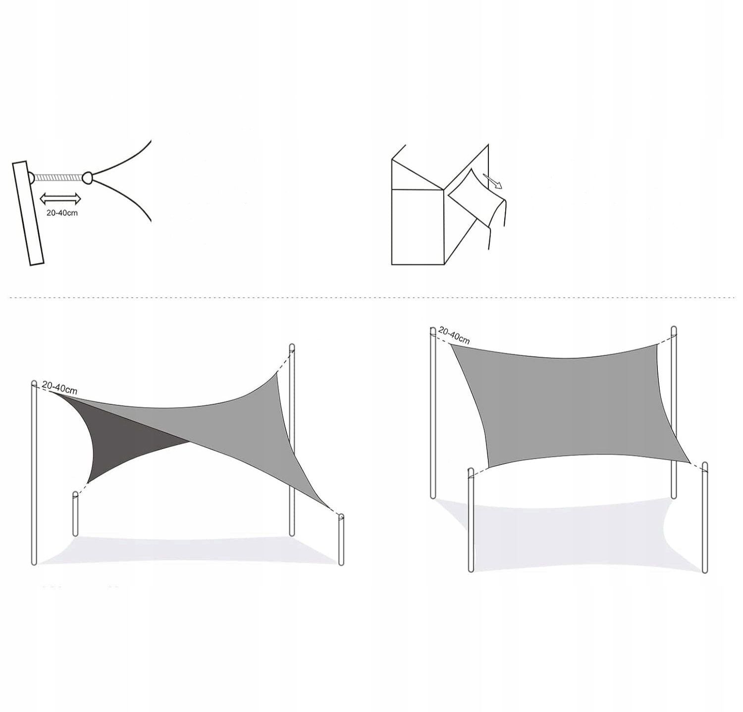 - Montaż: żagiel można łatwo zamontować przy użyciu dołączonych linek mocujących. Podczas instalacji zaleca się pozostawienie odstępu 20–40 cm pomiędzy punktem montażowym a pierścieniem D, co umożliwia prawidłowe napięcie materiału. Dla najlepszego efektu wodoodporności żagiel powinien być zamontowany pod kątem około 20–40°, aby zapobiec gromadzeniu się wody.